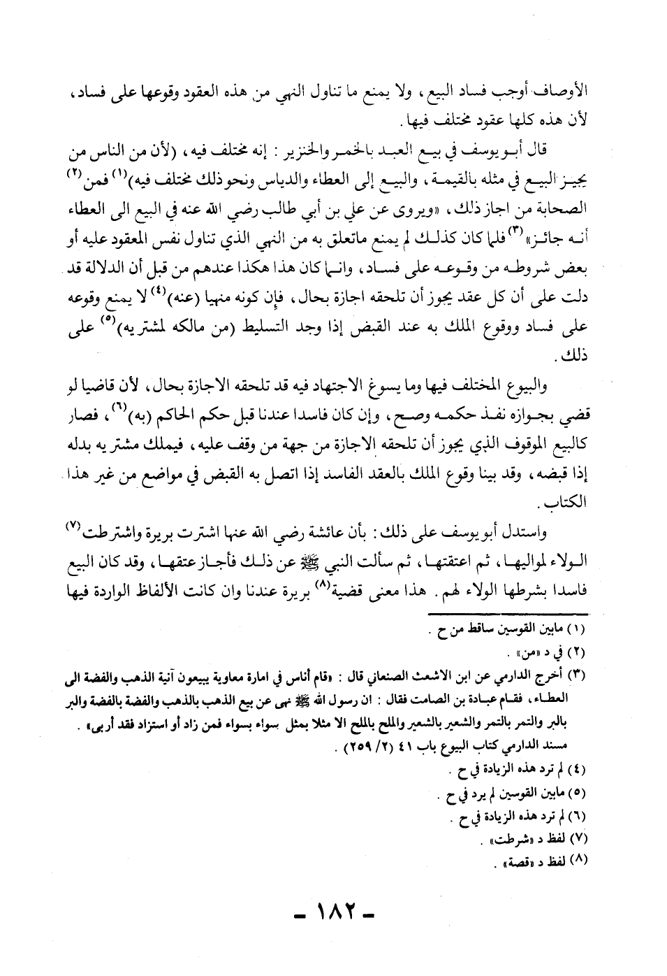 وَاسْتَدَلَّ أَبُو يُوسُفَ عَلَى ذَلِكَ: «بِأَنَّ عَائِشَةَ - رَضِيَ اللَّهُ عَنْهَا - اشْتَرَتْ بَرِيرَةَ وَاشْتَرَطَتْ الْوَلَاءَ لِمَوَالِيهَا، ثُمَّ أَعْتَقَتْهَا، ثُمَّ سَأَلَتْ النَّبِيَّ - صَلَّى اللَّهُ عَلَيْهِ وَسَلَّمَ - عَنْ ذَلِكَ فَأَجَازَ عِتْقَهَا» ، وَقَدْ كَانَ الْبَيْعُ فَاسِدًا بِشَرْطِهَا الْوَلَاءَ لَهُمْ. هَذَا مَعْنَى قَضِيَّةِ بَرِيرَةَ عِنْدَنَا وَإِنْ كَانَتْ الْأَلْفَاظُ الْوَارِدَةُ فِيهَا