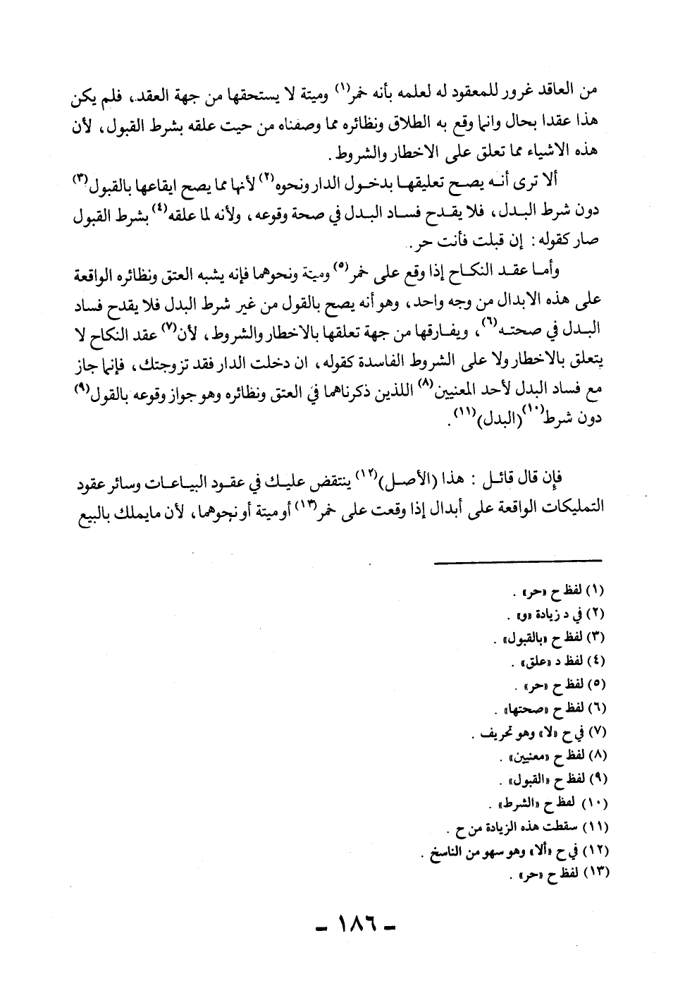 فَإِنْ قَالَ قَائِلٌ: هَذَا (الْأَصْلُ) يَنْتَقِضُ عَلَيْك فِي عُقُودِ الْبِيَاعَاتِ وَسَائِرِ عُقُودِ التَّمْلِيكَاتِ الْوَاقِعَةِ عَلَى أَبْدَالٍ إذَا وَقَعَتْ عَلَى خَمْرٍ أَوْ مَيْتَةٍ أَوْ نَحْوِهِمَا، لِأَنَّ مَا يُمْلَكُ بِالْبَيْعِ