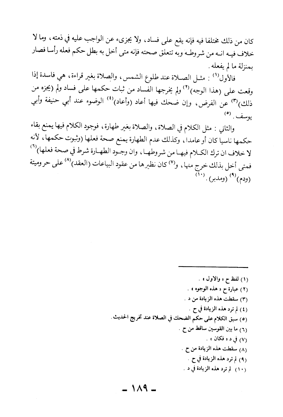 فَالْأَوَّلُ: مِثْلُ الصَّلَاةِ عِنْدَ طُلُوعِ الشَّمْسِ، وَالصَّلَاةِ بِغَيْرِ قِرَاءَةٍ، هِيَ فَاسِدَةٌ إذَا وَقَعَتْ عَلَى (هَذَا الْوَجْهِ) وَلَمْ يُخْرِجْهَا الْفَسَادُ مِنْ ثَبَاتِ حُكْمِهَا عَلَى فَسَادٍ وَلَمْ (يُجْزِهِ مِنْ ذَلِكَ) عَنْ الْفَرْضِ، وَإِنْ ضَحِكَ فِيهَا أَعَادَ (وَأَعَادَ) الْوُضُوءَ عِنْدَ أَبِي حَنِيفَةَ وَأَبِي يُوسُفَ. وَالثَّانِي: مِثْلُ الْكَلَامِ فِي الصَّلَاةِ، وَالصَّلَاةِ بِغَيْرِ طَهَارَةٍ، فَوُجُودُ الْكَلَامِ فِيهَا يَمْنَعُ بَقَاءَ حُكْمِهَا نَاسِيًا كَانَ أَوْ عَامِدًا، وَكَذَلِكَ عَدَمُ الطَّهَارَةِ يَمْنَعُ صِحَّةَ فِعْلِهَا (وَثُبُوتَ حُكْمِهَا؛ لِأَنَّهُ لَا خِلَافَ أَنَّ تَرْكَ الْكَلَامِ فِيهَا مِنْ شُرُوطِهَا، وَأَنَّ وُجُودَ الطَّهَارَةِ شَرْطٌ فِي صِحَّةِ فِعْلِهَا) فَمَتَى أَخَلَّ بِذَلِكَ خَرَجَ مِنْهَا، وَكَانَ نَظِيرُهَا مِنْ عُقُودِ الْبِيَاعَاتِ (الْعَقْدُ) عَلَى حُرٍّ وَمَيْتَةٍ (وَدَمٍ) (وَمُدَبَّرٍ) .