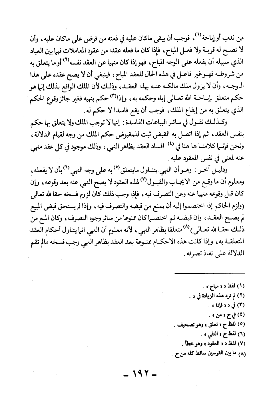 مِنْ نَدْبٍ أَوْ إبَاحَةٍ، فَوَجَبَ أَنْ يَبْقَى مَا كَانَ عَلَيْهِ فِي ذِمَّتِهِ مِنْ فَرْضٍ عَلَى مَا كَانَ عَلَيْهِ، وَأَنْ لَا تَصِحَّ لَهُ قُرْبَةٌ وَلَا فِعْلُ الْمُبَاحِ، فَإِذَا كَانَ مَا فَعَلَهُ عَقْدًا مِنْ عُقُودِ الْمُعَامَلَاتِ فِيمَا بَيْنَ الْعِبَادِ الَّذِي سَبِيلُهُ أَنْ يَفْعَلَهُ عَلَى الْوَجْهِ الْمُبَاحِ، فَهُوَ إذَا كَانَ مَنْهِيًّا عَنْ الْعَقْدِ نَفْسِهِ أَوْ مَا يَتَعَلَّقُ بِهِ مِنْ شُرُوطِهِ فَهُوَ غَيْرُ فَاعِلٍ فِي هَذِهِ الْحَالِ لِلْعَقْدِ الْمُبَاحِ، فَيَنْبَغِي أَنْ لَا يَصِحَّ عَقْدُهُ عَلَى هَذَا الْوَجْهِ، وَأَنْ لَا يَزُولَ مِلْكُ مَالِكِهِ عَنْهُ بِهَذَا الْعَقْدِ، وَذَلِكَ لِأَنَّ الْمِلْكَ الْوَاقِعَ بِذَلِكَ إنَّمَا هُوَ حُكْمٌ مُتَعَلِّقٌ بِإِبَاحَةِ اللَّهِ تَعَالَى إيَّاهُ وَحُكْمِهِ بِهِ، وَإِذَا حُكِمَ بِنَهْيِهِ فَغَيْرُ جَائِزٍ وُقُوعُ الْحُكْمِ الَّذِي يَتَعَلَّقُ بِهِ مِنْ إيقَاعِ الْمِلْكِ، فَوَجَبَ أَنْ يَقَعَ فَاسِدًا لَا حُكْمَ لَهُ.