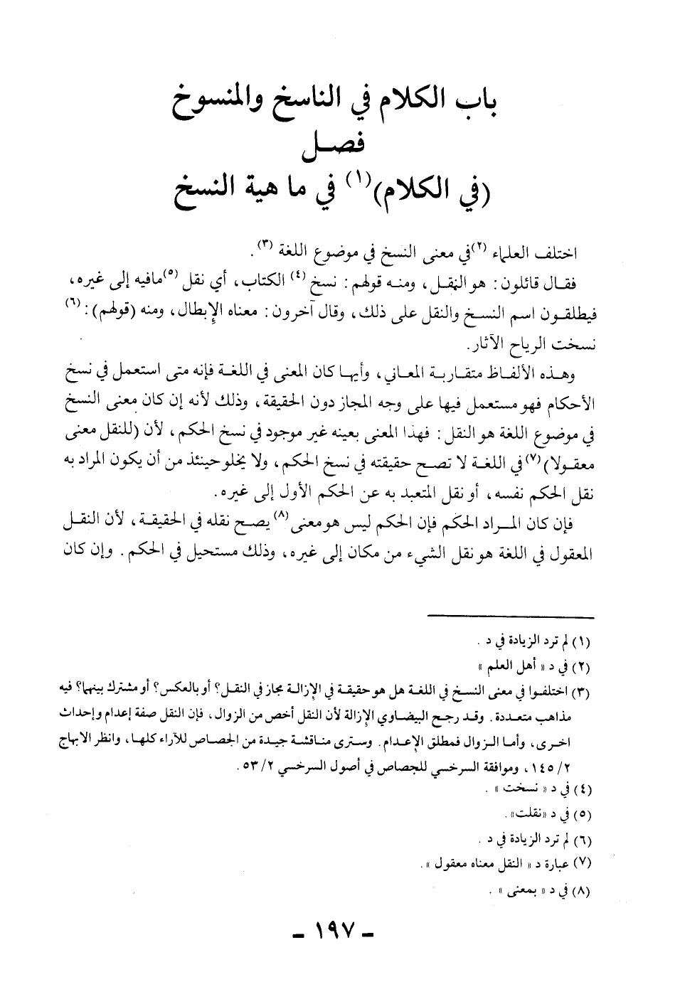 ِ فَصْلٌ (فِي الْكَلَامِ) فِي مَاهِيَّةِ النَّسْخِ. اخْتَلَفَ الْعُلَمَاءُ فِي مَعْنَى النَّسْخِ فِي مَوْضُوعِ اللُّغَةِ. فَقَالَ قَائِلُونَ: هُوَ النَّقْلُ، وَمِنْهُ قَوْلُهُمْ: نُسِخَ الْكِتَابُ، أَيْ نُقِلَ مَا فِيهِ إلَى غَيْرِهِ، فَيُطْلِقُونَ اسْمَ النَّسْخِ وَالنَّقْلِ عَلَى ذَلِكَ، وَقَالَ آخَرُونَ: مَعْنَاهُ الْإِبْطَالُ، وَمِنْهُ (قَوْلُهُمْ) : نَسَخَتْ الرِّيَاحُ الْآثَارَ. وَهَذِهِ الْأَلْفَاظُ مُتَقَارِبَةُ الْمَعَانِي، وَأَيُّهَا كَانَ الْمَعْنَى فِي اللُّغَةِ فَإِنَّهُ مَتَى اُسْتُعْمِلَ فِي نَسْخِ الْأَحْكَامِ فَهُوَ مُسْتَعْمَلٌ فِيهَا عَلَى وَجْهِ الْمَجَازِ دُونَ الْحَقِيقَةِ، وَذَلِكَ لِأَنَّهُ إنْ كَانَ مَعْنَى النَّسْخِ فِي مَوْضُوعِ اللُّغَةِ هُوَ النَّقْلَ: فَهَذَا الْمَعْنَى بِعَيْنِهِ غَيْرُ مَوْجُودٍ فِي نَسْخِ الْحُكْمِ، لِأَنَّ (لِلنَّقْلِ مَعْنًى مَعْقُولًا) فِي اللُّغَةِ لَا تَصِحُّ حَقِيقَتُهُ فِي نَسْخِ الْحُكْمِ، وَلَا يَخْلُو حِينَئِذٍ مِنْ أَنْ يَكُونَ الْمُرَادُ بِهِ نَقْلَ الْحُكْمِ نَفْسِهِ، أَوْ نَقْلَ الْمُتَعَبَّدِ بِهِ عَنْ الْحُكْمِ الْأَوَّلِ إلَى غَيْرِهِ. فَإِنْ كَانَ الْمُرَادُ الْحُكْمَ فَإِنَّ الْحُكْمَ لَيْسَ هُوَ مَعْنًى يَصِحُّ نَقْلُهُ فِي الْحَقِيقَةِ، لِأَنَّ النَّقْلَ الْمَعْقُولَ فِي اللُّغَةِ هُوَ نَقْلُ الشَّيْءِ مِنْ مَكَان إلَى غَيْرِهِ، وَذَلِكَ مُسْتَحِيلٌ فِي الْحُكْمِ. وَإِنْ كَانَ