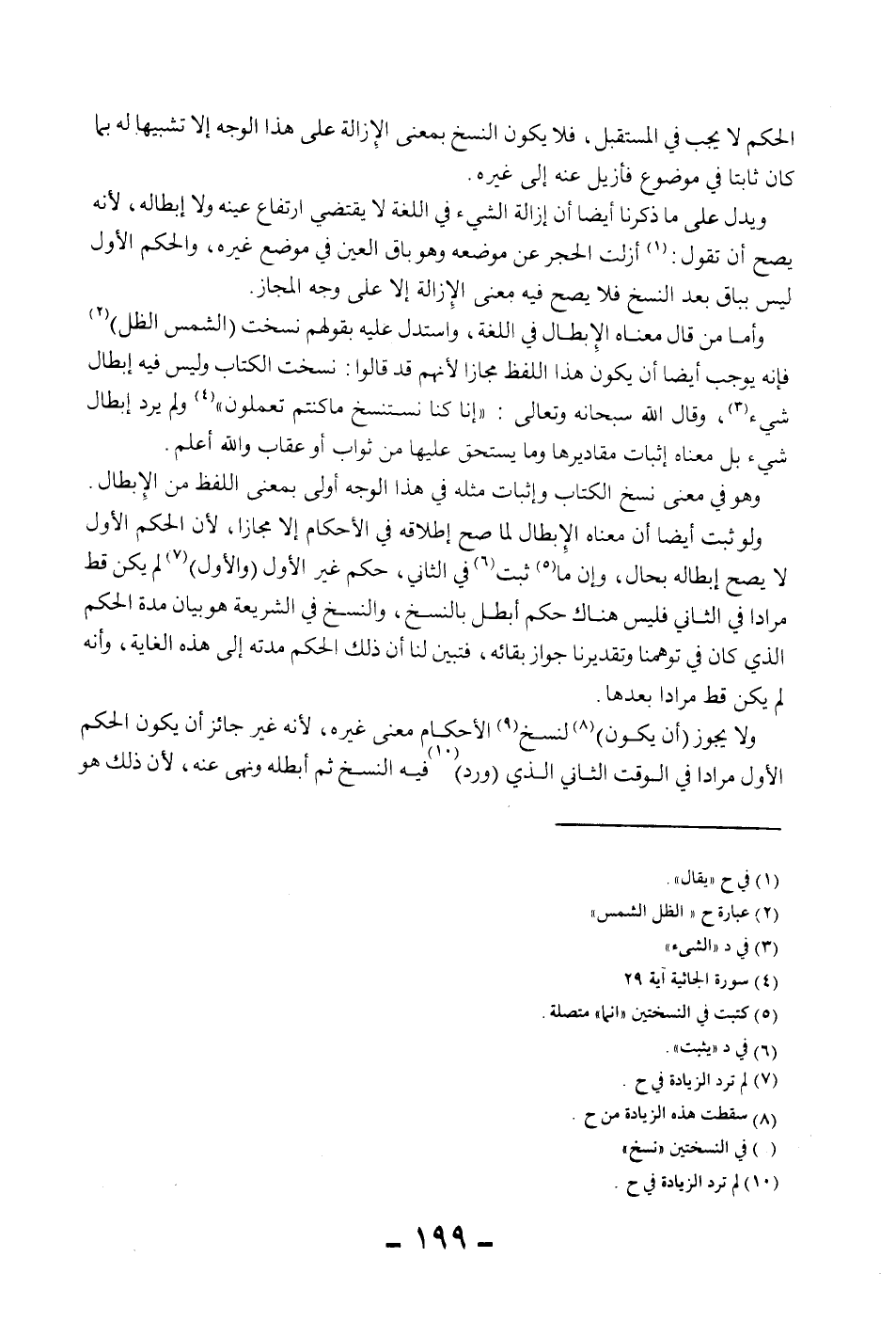 وَلَوْ ثَبَتَ أَيْضًا أَنَّ مَعْنَاهُ الْإِبْطَالُ لَمَا صَحَّ إطْلَاقُهُ فِي الْأَحْكَامِ إلَّا مَجَازًا؛ لِأَنَّ الْحُكْمَ الْأَوَّلَ لَا يَصِحُّ إبْطَالُهُ بِحَالٍ، وَأَنَّ مَا ثَبَتَ فِي الثَّانِي حُكْمُ غَيْرِ الْأَوَّلِ (وَالْأَوَّلُ) لَمْ يَكُنْ قَطُّ مُرَادًا فِي الثَّانِي فَلَيْسَ هُنَاكَ حُكْمٌ أُبْطِلَ بِالنَّسْخِ. وَالنَّسْخُ فِي الشَّرِيعَةِ هُوَ بَيَانُ مُدَّةِ الْحُكْمِ الَّذِي كَانَ فِي تَوَهُّمِنَا وَتَقْدِيرِنَا جَوَازُ بَقَائِهِ، فَتَبَيَّنَ لَنَا أَنَّ ذَلِكَ الْحُكْمَ مُدَّتُهُ إلَى هَذِهِ الْغَايَةِ، وَأَنَّهُ لَمْ يَكُنْ قَطُّ مُرَادًا بَعْدَهَا. وَلَا يَجُوزُ (أَنْ يَكُونَ) لِنَسْخِ الْأَحْكَامِ مَعْنًى غَيْرُهُ، لِأَنَّهُ غَيْرُ جَائِزٍ أَنْ يَكُونَ الْحُكْمُ الْأَوَّلُ مُرَادًا فِي الْوَقْتِ الثَّانِي الَّذِي (وَرَدَ) فِيهِ النَّسْخُ ثُمَّ أَبْطَلَهُ وَنَهَى عَنْهُ، لِأَنَّ ذَلِكَ هُوَ