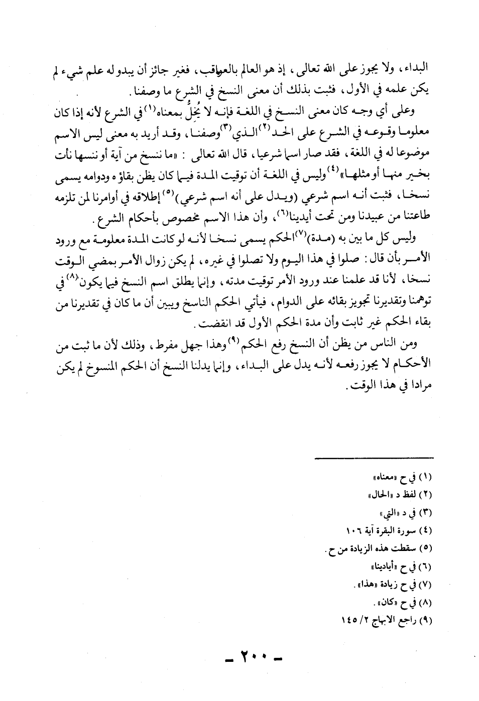 الْبَدَاءُ، وَلَا يَجُوزُ عَلَى اللَّهِ تَعَالَى، إذْ هُوَ الْعَالِمُ بِالْعَوَاقِبِ، فَغَيْرُ جَائِزٍ أَنْ يَبْدُوَ لَهُ عِلْمُ شَيْءٍ لَمْ يَكُنْ عَلِمَهُ فِي الْأَوَّلِ، فَثَبَتَ بِذَلِكَ أَنَّ مَعْنَى النَّسْخِ فِي الشَّرْعِ مَا وَصَفْنَا. وَعَلَى أَيِّ وَجْهٍ كَانَ مَعْنَى النَّسْخِ فِي اللُّغَةِ فَإِنَّهُ لَا يُخِلُّ بِمَعْنَاهُ فِي الشَّرْعِ لِأَنَّهُ إذَا كَانَ مَعْلُومًا وُقُوعُهُ فِي الشَّرْعِ عَلَى الْحَدِّ الَّذِي وَصَفْنَا، وَقَدْ أُرِيدَ بِهِ مَعْنًى لَيْسَ الِاسْمُ مَوْضُوعًا لَهُ فِي اللُّغَةِ، فَقَدْ صَارَ اسْمًا شَرْعِيًّا، قَالَ اللَّهُ تَعَالَى: {مَا نَنْسَخْ مِنْ آيَةٍ أَوْ نُنْسِهَا نَأْتِ بِخَيْرٍ مِنْهَا أَوْ مِثْلِهَا} [البقرة: 106] وَلَيْسَ فِي اللُّغَةِ أَنَّ تَوْقِيتَ الْمُدَّةِ فِيمَا كَانَ يُظَنُّ بَقَاؤُهُ وَدَوَامُهُ يُسَمَّى نَسْخًا، فَثَبَتَ أَنَّهُ اسْمٌ شَرْعِيٌّ.