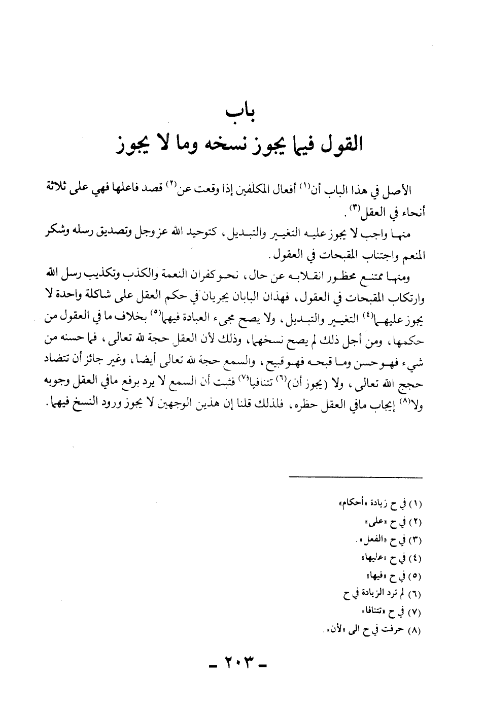 ُ الْأَصْلُ فِي هَذَا الْبَابِ أَنَّ أَفْعَالَ الْمُكَلَّفِينَ إذَا وَقَعَتْ عَنْ قَصْدِ فَاعِلِهَا فَهِيَ عَلَى ثَلَاثَةِ أَنْحَاءٍ فِي الْعَقْلِ. مِنْهَا وَاجِبٌ لَا يَجُوزُ عَلَيْهِ التَّغْيِيرُ وَالتَّبْدِيلُ، كَتَوْحِيدِ اللَّهِ عَزَّ وَجَلَّ وَتَصْدِيقِ رُسُلِهِ وَشُكْرِ الْمُنْعِمِ وَاجْتِنَابِ الْمُقَبَّحَاتِ فِي الْعُقُولِ. وَمِنْهَا مُمْتَنِعٌ مَحْظُورٌ انْقِلَابُهُ عَنْ حَالٍ، نَحْوُ كُفْرَانِ النِّعْمَةِ وَالْكَذِبِ وَتَكْذِيبِ رُسُلِ اللَّهِ وَارْتِكَابِ الْمُقَبَّحَاتِ فِي الْعُقُولِ، فَهَذَانِ الْبَابَانِ يَجْرِيَانِ فِي حُكْمِ الْعَقْلِ عَلَى شَاكِلَةٍ وَاحِدَةٍ لَا يَجُوزُ عَلَيْهِمَا التَّغْيِيرُ وَالتَّبْدِيلُ، وَلَا يَصِحُّ مَجِيءُ الْعِبَادِ فِيهِمَا بِخِلَافِ مَا فِي الْعُقُولِ مِنْ حُكْمِهَا، وَمِنْ أَجْلِ ذَلِكَ لَمْ يَصِحَّ نَسْخُهُمَا، وَذَلِكَ لِأَنَّ الْعَقْلَ حُجَّةٌ لِلَّهِ تَعَالَى، فَمَا حَسَّنَهُ مِنْ شَيْءٍ فَهُوَ حَسَنٌ وَمَا قَبَّحَهُ فَهُوَ قَبِيحٌ، وَالسَّمْعُ حُجَّةٌ لِلَّهِ تَعَالَى أَيْضًا، وَغَيْرُ جَائِزٍ أَنْ تَتَضَادَّ حُجَجُ اللَّهِ تَعَالَى، وَلَا (يَجُوزُ أَنْ) تَتَنَافَيَا فَثَبَتَ أَنَّ السَّمْعَ لَا يَرِدُ بِرَفْعِ مَا فِي الْعَقْلِ وُجُوبُهُ وَلَا إيجَابِ مَا فِي الْعَقْلِ حَظْرُهُ، فَلِذَلِكَ قُلْنَا إنَّ هَذَيْنِ الْوَجْهَيْنِ لَا يَجُوزُ وُرُودُ النَّسْخِ فِيهِمَا.