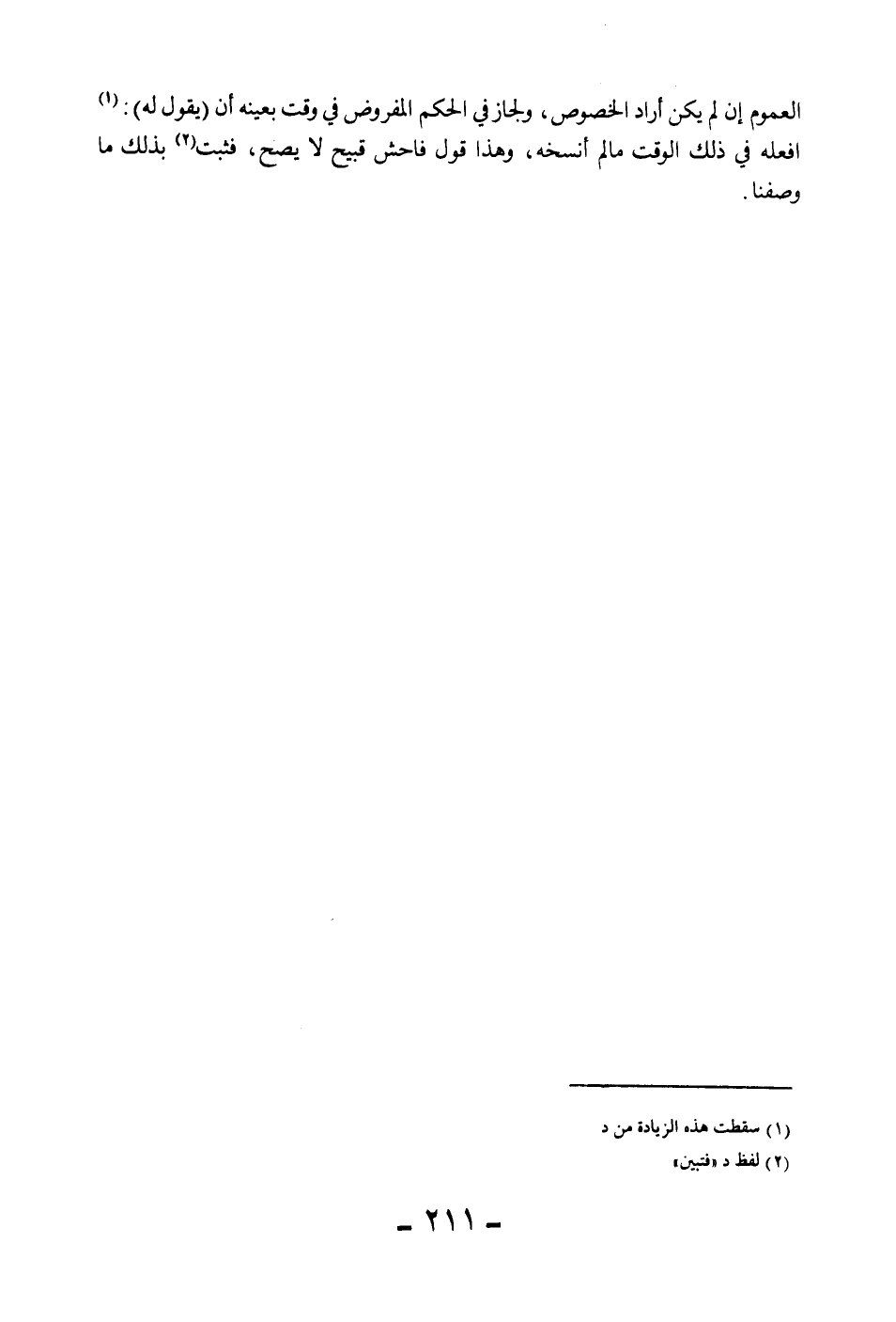 الْعُمُومَ إنْ لَمْ يَكُنْ أَرَادَ الْخُصُوصَ، وَلَجَازَ فِي الْحُكْمِ الْمَفْرُوضِ فِي وَقْتٍ بِعَيْنِهِ أَنْ (يَقُولَ لَهُ) : افْعَلْهُ فِي ذَلِكَ الْوَقْتِ مَا لَمْ أَنْسَخْهُ، وَهَذَا قَوْلٌ فَاحِشٌ قَبِيحٌ لَا يَصِحُّ، فَثَبَتَ بِذَلِكَ مَا وَصَفْنَا.