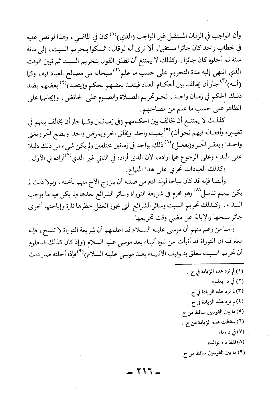 وَكَذَلِكَ لَا يَمْتَنِعُ أَنْ تُطْلِقَ الْقَوْلَ بِتَحْرِيمِ السَّبْتِ ثُمَّ تُبَيِّنَ الْوَقْتَ الَّذِي انْتَهَى إلَيْهِ مُدَّةُ التَّحْرِيمِ عَلَى حَسَبِ مَا عَلِمَ سُبْحَانَهُ مِنْ مَصَالِحِ الْعِبَادِ فِيهِ، وَكَمَا (أَنَّهُ) جَازَ أَنْ يُخَالِفَ بَيْنَ أَحْكَامِ الْعِبَادِ فَيَتَعَبَّدُ بَعْضَهُمْ بِحُكْمٍ، وَ (يَتَعَبَّدُ) بَعْضَهُمْ بِضِدِّ ذَلِكَ الْحُكْمِ فِي زَمَانٍ وَاحِدٍ، نَحْوُ تَحْرِيمِ الصَّلَاةِ وَالصَّوْمِ عَلَى الْحَائِضِ، وَإِيجَابِهِمَا عَلَى الطَّاهِرِ عَلَى حَسَبِ مَا عُلِمَ مِنْ مَصَالِحِهِمْ. كَذَلِكَ لَا يَمْتَنِعُ أَنْ يُخَالِفَ بَيْنَ أَحْكَامِهِمْ (فِي زَمَانَيْنِ وَكَمَا جَازَ أَنْ يُخَالِفَ بَيْنَهُمْ فِي تَغْيِيرِهِ وَأَفْعَالِهِ فِيهِمْ نَحْوُ أَنْ) يُمِيتَ وَاحِدًا وَيَخْلُقَ آخَرَ وَيُمْرِضَ وَاحِدًا وَيُصِحَّ آخَرَ وَيُغْنِيَ وَاحِدًا وَيُفْقِرَ آخَرَ، وَ (يَفْعَلَ) ذَلِكَ بِوَاحِدٍ فِي زَمَانَيْنِ مُخْتَلِفَيْنِ وَلَمْ يَكُنْ شَيْءٌ مِنْ ذَلِكَ دَلِيلًا عَلَى الْبَدَاءِ وَعَلَى الرُّجُوعِ عَمَّا أَرَادَهُ، لِأَنَّ الَّذِي أَرَادَهُ فِي الثَّانِي غَيْرُ الَّذِي أَرَادَهُ فِي الْأَوَّلِ. وَكَذَلِكَ الْعِبَادَاتُ تَجْرِي عَلَى هَذَا الْمِنْهَاجِ. وَأَيْضًا فَإِنَّهُ قَدْ كَانَ مُبَاحًا لِوَلَدِ آدَمَ مِنْ صُلْبِهِ أَنْ يَتَزَوَّجَ الْأَخُ مِنْهُمْ بِأُخْتِهِ، وَلَوْلَا ذَلِكَ لَمْ يَكُنْ بَيْنَهُمْ تَنَاسُلٌ وَهُوَ مُحَرَّمٌ فِي شَرِيعَةِ التَّوْرَاةِ وَسَائِرِ الشَّرَائِعِ بَعْدَهَا وَلَمْ يَكُنْ فِيهِ مَا يُوجِبُ الْبَدَاءَ، وَكَذَلِكَ تَحْرِيمُ السَّبْتِ وَسَائِرُ الشَّرَائِعِ الَّتِي يُجَوِّزُ الْعَقْلُ حَظْرَهَا تَارَةً وَإِبَاحَتَهَا أُخْرَى جَائِزٌ نَسْخُهَا وَالْإِبَانَةُ عَنْ مُضِيِّ وَقْتِ تَحْرِيمِهَا.