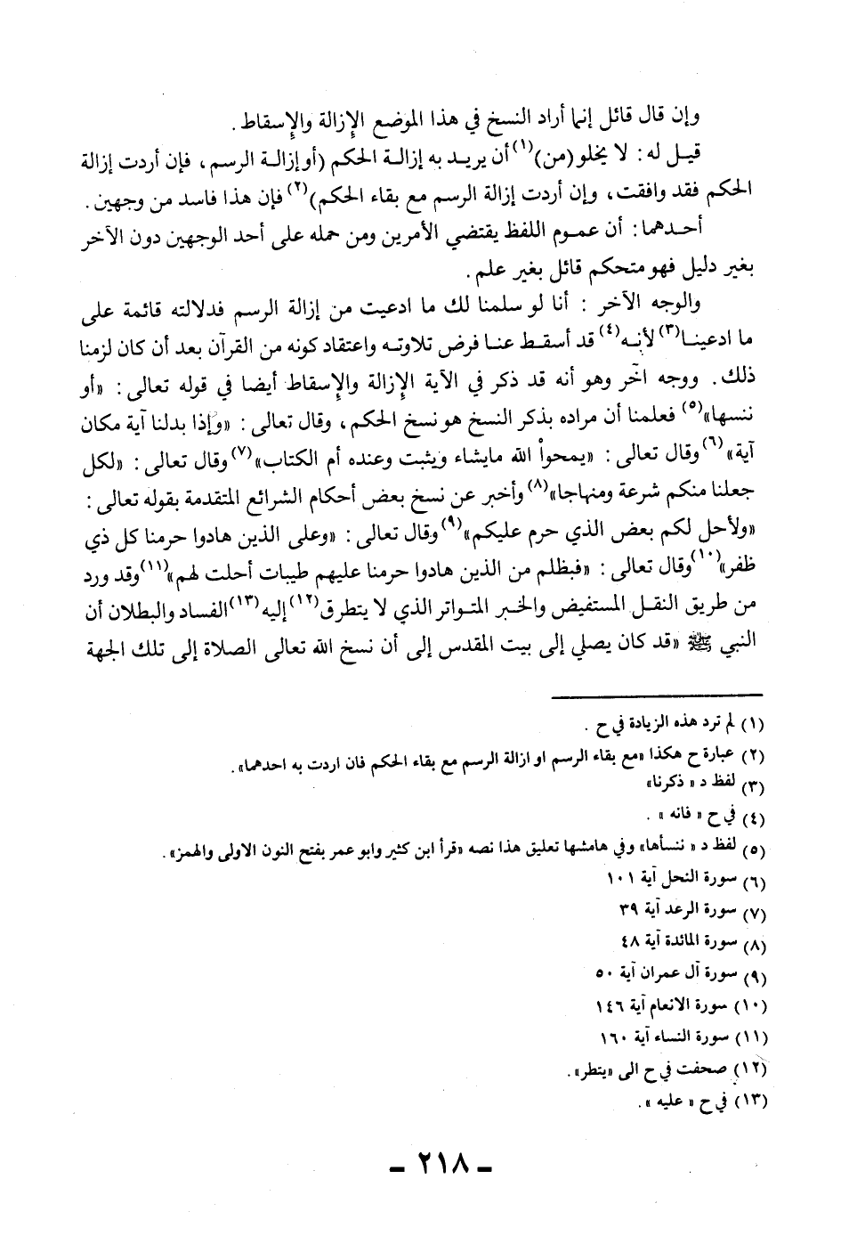 وَإِنْ قَالَ قَائِلٌ إنَّمَا أَرَادَ النَّسْخَ فِي هَذَا الْمَوْضِعِ الْإِزَالَةَ وَالْإِسْقَاطَ. قِيلَ لَهُ: لَا يَخْلُو (مِنْ) أَنْ يُرِيدَ بِهِ إزَالَةَ الْحُكْمِ (أَوْ إزَالَةَ الرَّسْمِ، فَإِنْ أَرَدْت إزَالَةَ الْحُكْمِ فَقَدْ وَافَقْت، وَإِنْ أَرَدْت إزَالَةَ الرَّسْمِ مَعَ بَقَاءِ الْحُكْمِ) فَإِنَّ هَذَا فَاسِدٌ مِنْ وَجْهَيْنِ. أَحَدُهُمَا: أَنَّ عُمُومَ اللَّفْظِ يَقْتَضِي الْأَمْرَيْنِ وَمَنْ حَمَلَهُ عَلَى أَحَدِ الْوَجْهَيْنِ دُونَ الْآخَرِ بِغَيْرِ دَلِيلٍ فَهُوَ مُتَحَكِّمٌ قَائِلٌ بِغَيْرِ عِلْمٍ. وَالْوَجْهُ الْآخَرُ: أَنَّا لَوْ سَلَّمْنَا لَك مَا ادَّعَيْت مِنْ إزَالَةِ الرَّسْمِ فَدَلَالَتُهُ قَائِمَةٌ عَلَى مَا ادَّعَيْنَا لِأَنَّهُ قَدْ أَسْقَطَ عَنَّا فَرْضَ تِلَاوَتِهِ وَاعْتِقَادَ كَوْنِهِ مِنْ الْقُرْآنِ بَعْدَ أَنْ كَانَ لَزِمَنَا ذَلِكَ. وَوَجْهٌ آخَرُ وَهُوَ أَنَّهُ قَدْ ذَكَرَ فِي الْآيَةِ الْإِزَالَةَ وَالْإِسْقَاطَ أَيْضًا فِي قَوْله تَعَالَى: {أَوْ نُنْسِهَا} [البقرة: 106] فَعَلِمْنَا أَنَّ مُرَادَهُ بِذِكْرِ النَّسْخِ هُوَ نَسْخُ الْحُكْمِ.