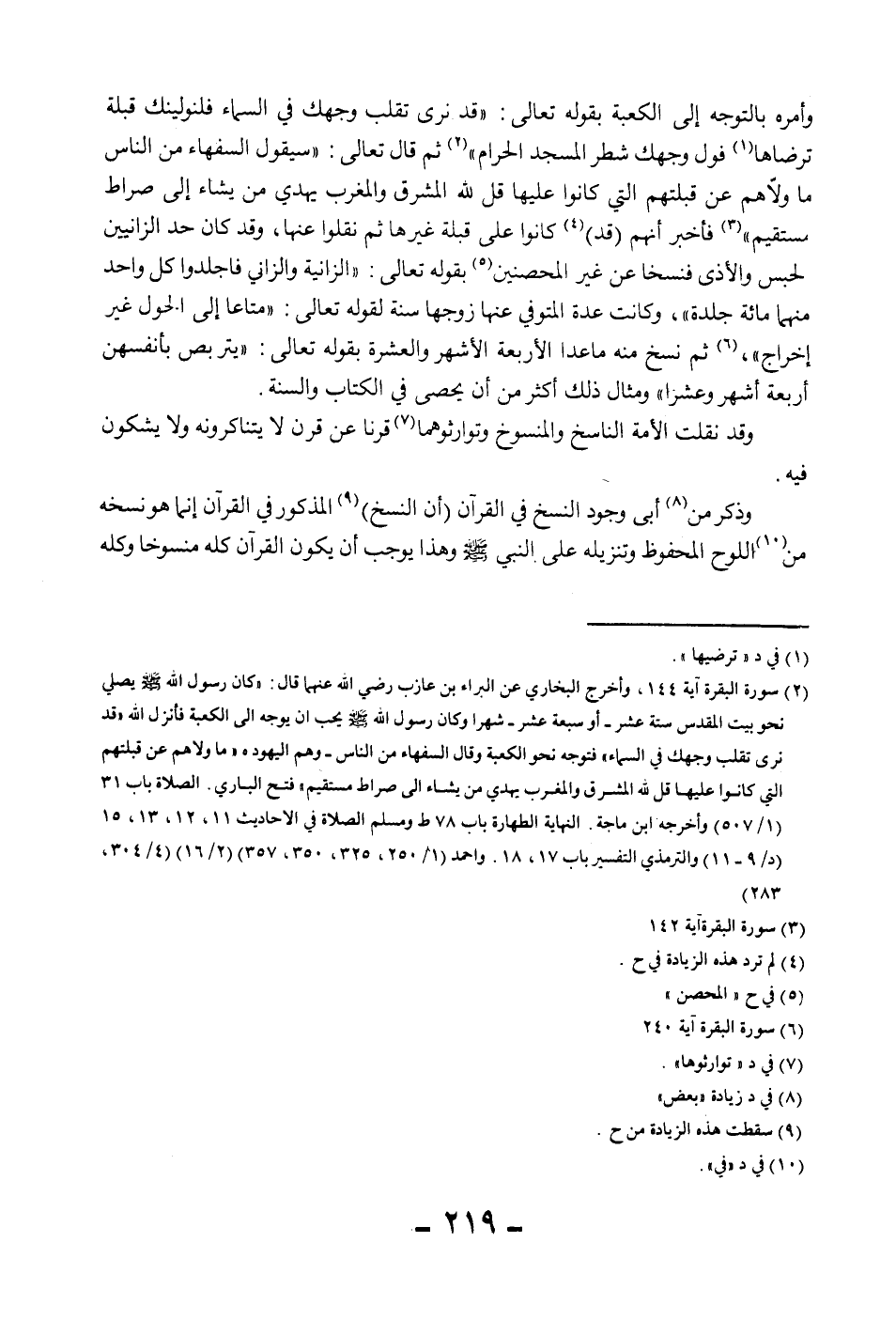 وَأَمَرَهُ بِالتَّوَجُّهِ إلَى الْكَعْبَةِ بِقَوْلِهِ تَعَالَى: {قَدْ نَرَى تَقَلُّبَ وَجْهِك فِي السَّمَاءِ فَلَنُوَلِّيَنَّكَ قِبْلَةً تَرْضَاهَا فَوَلِّ وَجْهَك شَطْرَ الْمَسْجِدِ الْحَرَامِ} [البقرة: 144] » ثُمَّ قَالَ تَعَالَى: {سَيَقُولُ السُّفَهَاءُ مِنْ النَّاسِ مَا وَلَّاهُمْ عَنْ قِبْلَتِهِمْ الَّتِي كَانُوا عَلَيْهَا قُلْ لِلَّهِ الْمَشْرِقُ وَالْمَغْرِبُ يَهْدِي مَنْ يَشَاءُ إلَى صِرَاطٍ مُسْتَقِيمٍ} [البقرة: 142] فَأَخْبَرَ أَنَّهُمْ (قَدْ) كَانُوا عَلَى قِبْلَةٍ غَيْرِهَا ثُمَّ نُقِلُوا عَنْهَا، وَقَدْ كَانَ حَدُّ الزَّانِيَيْنِ الْحَبْسَ وَالْأَذَى فَنُسِخَا عَنْ غَيْرِ الْمُحْصَنِينَ بِقَوْلِهِ تَعَالَى: {الزَّانِيَةُ وَالزَّانِي فَاجْلِدُوا كُلَّ وَاحِدٍ مِنْهُمَا مِائَةَ جَلْدَةٍ} [النور: 2] ، وَكَانَتْ عِدَّةُ الْمُتَوَفَّى عَنْهَا زَوْجُهَا سَنَةً لِقَوْلِهِ تَعَالَى: {مَتَاعًا إلَى الْحَوْلِ غَيْرَ إخْرَاجٍ} [البقرة: 240] ، ثُمَّ نُسِخَ مِنْهُ مَا عَدَا الْأَرْبَعَةَ الْأَشْهُرِ وَالْعَشَرَةِ بِقَوْلِهِ تَعَالَى: {يَتَرَبَّصْنَ بِأَنْفُسِهِنَّ أَرْبَعَةَ أَشْهُرٍ وَعَشْرًا} [البقرة: 234] وَمِثَالُ ذَلِكَ أَكْثَرُ مِنْ أَنْ يُحْصَى فِي الْكِتَابِ وَالسُّنَّةِ. وَقَدْ نَقَلَتْ الْأُمَّةُ النَّاسِخَ وَالْمَنْسُوخَ وَتَوَارَثُوهُمَا قَرْنًا عَنْ قَرْنٍ لَا يَتَنَاكَرُونَهُ وَلَا يَشُكُّونَ فِيهِ. وَذَكَرَ مَنْ أَبَى وُجُودَ النَّسْخِ فِي الْقُرْآنِ (أَنَّ النَّسْخَ) الْمَذْكُورَ فِي الْقُرْآنِ إنَّمَا هُوَ نَسْخُهُ مِنْ اللَّوْحِ الْمَحْفُوظِ وَتَنْزِيلُهُ عَلَى النَّبِيِّ - صَلَّى اللَّهُ عَلَيْهِ وَسَلَّمَ - وَهَذَا يُوجِبُ أَنْ يَكُونَ الْقُرْآنُ كُلُّهُ مَنْسُوخًا وَكُلُّهُ