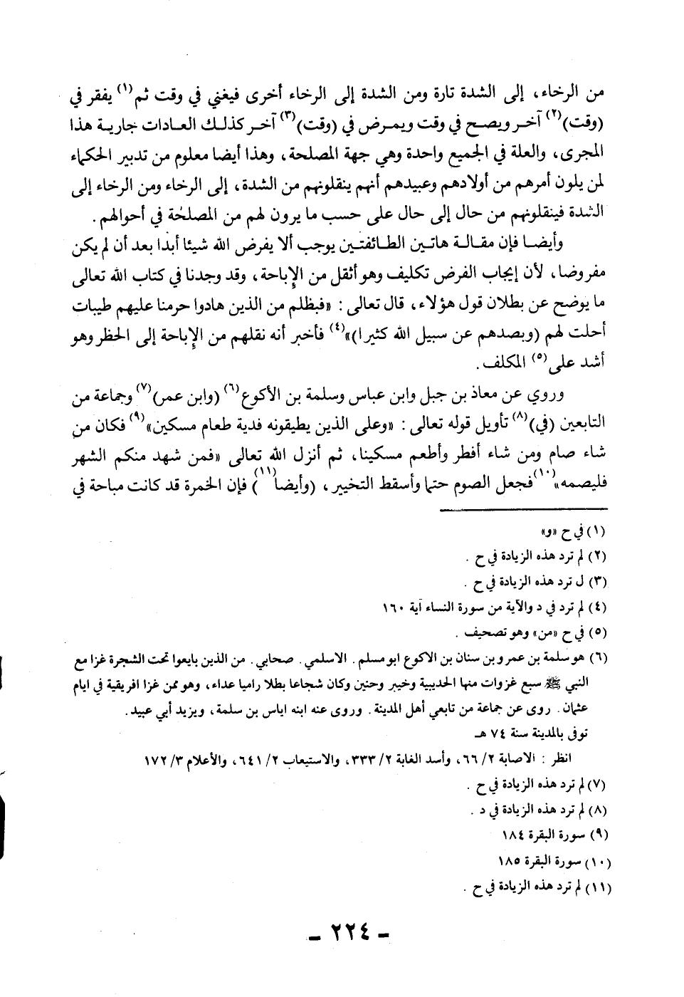 مِنْ الرَّخَاءِ، إلَى الشِّدَّةِ تَارَةً وَمِنْ الشِّدَّةِ إلَى الرَّخَاءِ أُخْرَى فَيُغْنِي فِي وَقْتٍ ثُمَّ يُفْقِرُ فِي (وَقْتٍ) آخَرَ وَيُصِحُّ فِي وَقْتٍ وَيُمْرِضُ فِي (وَقْتٍ) آخَرَ كَذَلِكَ الْعَادَاتُ جَارِيَةٌ هَذَا الْمَجْرَى، وَالْعِلَّةُ فِي الْجَمِيعِ وَاحِدَةٌ وَهِيَ جِهَةُ الْمَصْلَحَةِ، وَهَذَا أَيْضًا مَعْلُومٌ مِنْ تَدْبِيرِ الْحُكَمَاءِ لِمَنْ يَلُونَ أَمْرَهُمْ مِنْ أَوْلَادِهِمْ وَعَبِيدِهِمْ أَنَّهُمْ يَنْقُلُونَهُمْ مِنْ الشِّدَّةِ، إلَى الرَّخَاءِ وَمِنْ الرَّخَاءِ إلَى الشِّدَّةِ فَيَنْقُلُونَهُمْ مِنْ حَالٍ إلَى حَالٍ عَلَى حَسَبِ مَا يَرَوْنَ لَهُمْ مِنْ الْمَصْلَحَةِ فِي أَحْوَالِهِمْ. وَأَيْضًا فَإِنَّ مَقَالَةَ هَاتَيْنِ الطَّائِفَتَيْنِ يُوجِبُ أَلَا يَفْرِضَ اللَّهُ شَيْئًا أَبَدًا بَعْدَ أَنْ لَمْ يَكُنْ مَفْرُوضًا، لِأَنَّ إيجَابَ الْفَرْضِ تَكْلِيفٌ وَهُوَ أَثْقَلُ مِنْ الْإِبَاحَةِ، وَقَدْ وَجَدْنَا فِي كِتَابِ اللَّهِ تَعَالَى مَا يُوَضِّحُ عَنْ بُطْلَانِ قَوْلِ هَؤُلَاءِ، قَالَ تَعَالَى: {فَبِظُلْمٍ مِنْ الَّذِينَ هَادُوا حَرَّمْنَا عَلَيْهِمْ طَيِّبَاتٍ أُحِلَّتْ لَهُمْ وَبِصَدِّهِمْ عَنْ سَبِيلِ اللَّهِ كَثِيرًا} [النساء: 160] فَأَخْبَرَ أَنَّهُ نَقَلَهُمْ مِنْ الْإِبَاحَةِ إلَى الْحَظْرِ وَهُوَ أَشَدُّ عَلَى الْمُكَلَّفِ.