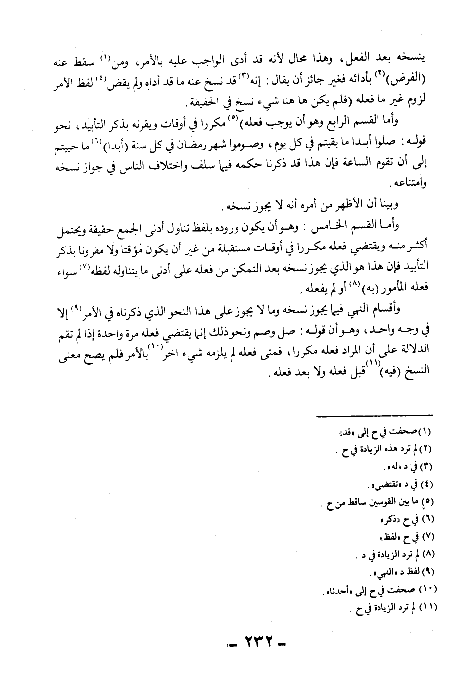 يَنْسَخُهُ بَعْدَ الْفِعْلِ، وَهَذَا مُحَالٌ لِأَنَّهُ قَدْ أَدَّى الْوَاجِبَ عَلَيْهِ بِالْأَمْرِ، وَمَنْ سَقَطَ عَنْهُ (الْفَرْضُ) بِأَدَائِهِ فَغَيْرُ جَائِزٍ أَنْ يُقَالَ: إنَّهُ قَدْ نُسِخَ عَنْهُ مَا قَدْ أَدَّاهُ وَلَمْ يَقْضِ لَفْظُ الْأَمْرِ لُزُومَ غَيْرِ مَا فَعَلَهُ (فَلَمْ يَكُنْ هَاهُنَا شَيْءٌ نُسِخَ فِي الْحَقِيقَةِ. وَأَمَّا الْقِسْمُ الرَّابِعُ وَهُوَ أَنْ يُوجِبَ فِعْلَهُ)