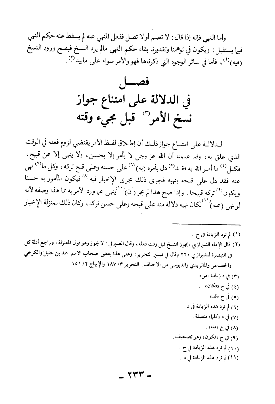 [فَصْلٌ فِي الدَّلَالَةِ عَلَى امْتِنَاعِ جَوَازِ نَسْخِ الْأَمْرِ قَبْلَ مَجِيءِ وَقْتِهِ]