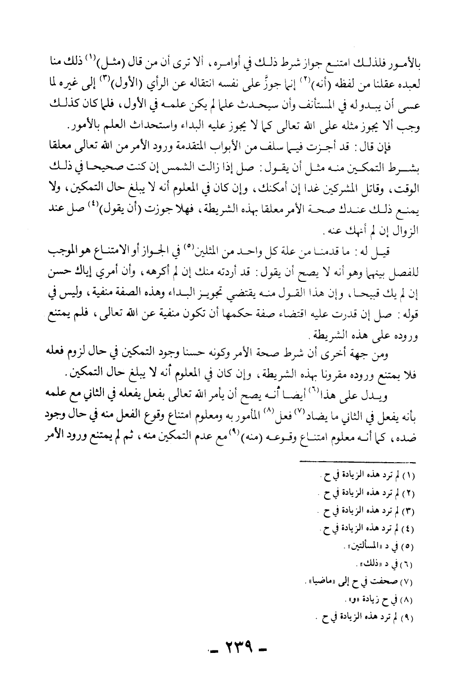بِالْأُمُورِ فَلِذَلِكَ امْتَنَعَ جَوَازُ شَرْطِ ذَلِكَ فِي أَوَامِرِهِ، أَلَا تَرَى أَنَّ مَنْ قَالَ (مِثْلَ) ذَلِكَ مِنَّا لِعَبْدِهِ عَقَلْنَا مِنْ لَفْظِهِ (أَنَّهُ) إنَّمَا جَوَّزَ عَلَى نَفْسِهِ انْتِقَالَهُ عَنْ الرَّأْيِ (الْأَوَّلِ) إلَى غَيْرِهِ لِمَا عَسَى أَنْ يَبْدُوَ لَهُ فِي الْمُسْتَأْنَفِ وَأَنْ سَيَحْدُثُ عِلْمًا لَمْ يَكُنْ عَلِمَهُ فِي الْأَوَّلِ، فَلَمَّا كَانَ كَذَلِكَ وَجَبَ أَلَّا يَجُوزَ مِثْلُهُ عَلَى اللَّهِ تَعَالَى كَمَا لَا يَجُوزُ عَلَيْهِ الْبَدَاءُ وَاسْتِحْدَاثُ الْعِلْمِ بِالْأُمُورِ. فَإِنْ قَالَ: قَدْ أَجَزْت فِيمَا سَلَفَ مِنْ الْأَبْوَابِ الْمُتَقَدِّمَةِ.