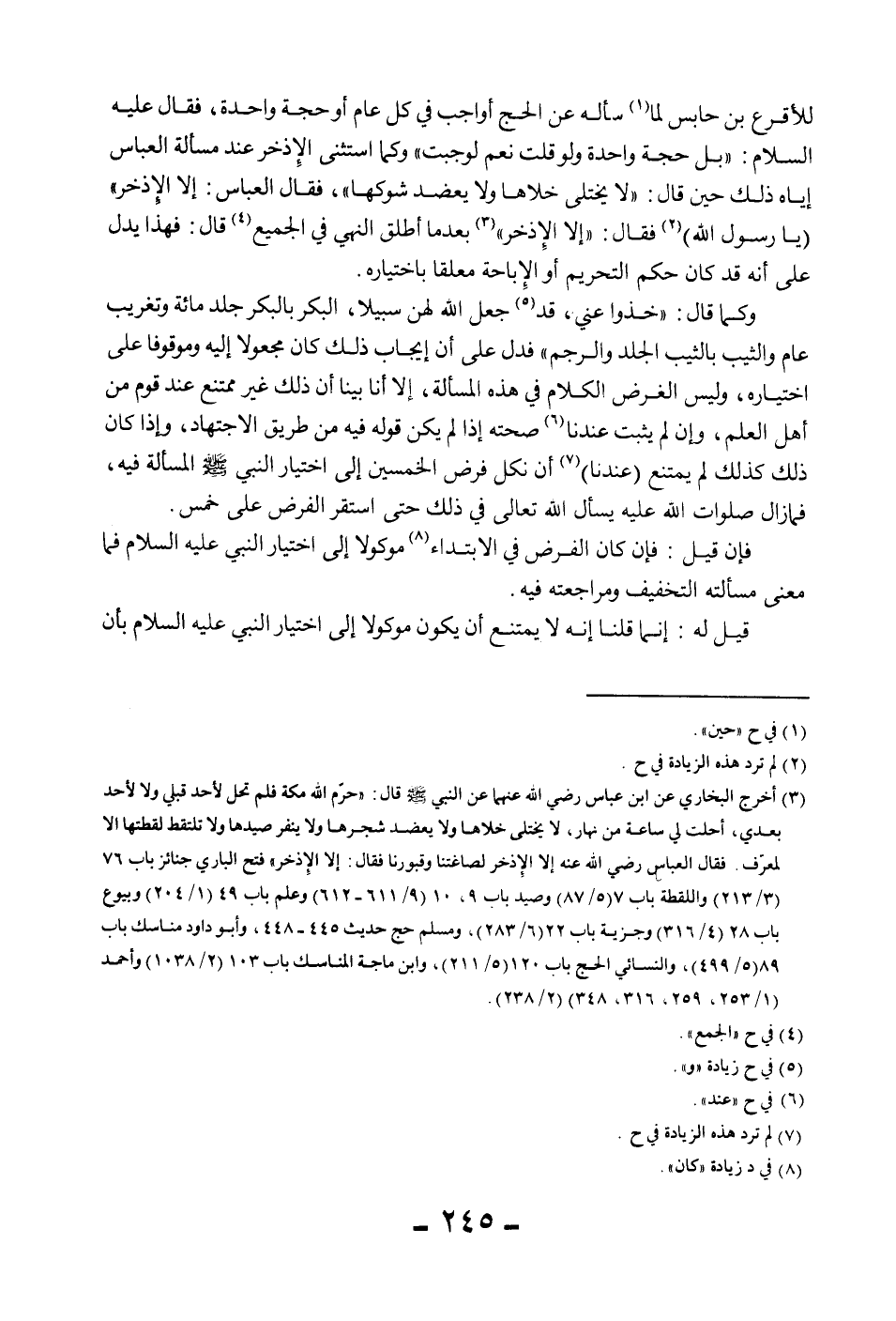 لِلْأَقْرَعِ بْنِ حَابِسٍ لَمَّا سَأَلَهُ عَنْ الْحَجِّ أَوَاجِبٌ فِي كُلِّ عَامٍ أَوْ حَجَّةٌ وَاحِدَةٌ، فَقَالَ - عَلَيْهِ السَّلَامُ -: بَلْ حَجَّةٌ وَاحِدَةٌ وَلَوْ قُلْتُ نَعَمْ لَوَجَبَتْ» وَكَمَا اسْتَثْنَى الْإِذْخِرَ عِنْدَ مَسْأَلَةِ الْعَبَّاسِ إيَّاهُ ذَلِكَ حِينَ قَالَ: «لَا يُخْتَلَى خَلَاهَا وَلَا يُعْضَدُ شَوْكُهَا، فَقَالَ الْعَبَّاسُ: إلَّا الْإِذْخِرَ يَا رَسُولَ اللَّهِ فَقَالَ: إلَّا الْإِذْخِرَ» بَعْدَمَا أَطْلَقَ النَّهْيَ فِي الْجَمِيعِ قَالَ: فَهَذَا يَدُلُّ عَلَى أَنَّهُ قَدْ كَانَ حُكْمُ التَّحْرِيمِ أَوْ الْإِبَاحَةِ مُعَلَّقًا بِاخْتِيَارِهِ. وَكَمَا قَالَ: «خُذُوا عَنِّي قَدْ جَعَلَ اللَّهُ لَهُنَّ سَبِيلًا، الْبِكْرُ بِالْبِكْرِ جَلْدُ مِائَةٍ وَتَغْرِيبُ عَامٍ وَالثَّيِّبُ بِالثَّيِّبِ الْجَلْدُ وَالرَّجْمُ» فَدَلَّ عَلَى أَنَّ إيجَابَ ذَلِكَ كَانَ مَجْعُولًا إلَيْهِ وَمَوْقُوفًا عَلَى اخْتِيَارِهِ، وَلَيْسَ الْغَرَضُ الْكَلَامَ فِي هَذِهِ الْمَسْأَلَةِ، إلَّا أَنَّا بَيَّنَّا أَنَّ ذَلِكَ غَيْرُ مُمْتَنِعٍ عِنْدَ قَوْمٍ مِنْ أَهْلِ الْعِلْمِ، وَإِنْ لَمْ يَثْبُتْ عِنْدَنَا صِحَّتُهُ إذَا لَمْ يَكُنْ قَوْلُهُ فِيهِ مِنْ طَرِيقِ الِاجْتِهَادِ، وَإِذَا كَانَ ذَلِكَ كَذَلِكَ لَمْ يَمْتَنِعْ (عِنْدَنَا) أَنْ نَكِلَ فَرْضَ الْخَمْسِينَ إلَى اخْتِيَارِ النَّبِيِّ - صَلَّى اللَّهُ عَلَيْهِ وَسَلَّمَ - الْمَسْأَلَةَ فِيهِ، فَمَا زَالَ صَلَوَاتُ اللَّهِ عَلَيْه يَسْأَلُ اللَّهَ تَعَالَى فِي ذَلِكَ حَتَّى اسْتَقَرَّ الْفَرْضُ عَلَى خَمْسٍ.