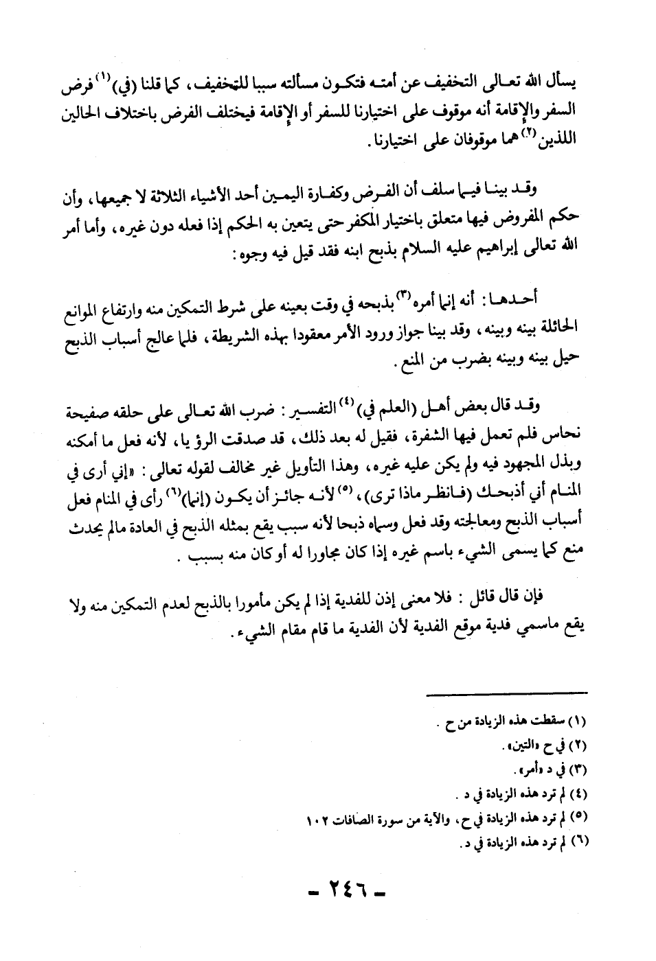 يَسْأَلَ اللَّهَ تَعَالَى التَّخْفِيفَ عَنْ أُمَّتِهِ فَتَكُونُ مَسْأَلَتُهُ سَبَبًا لِلتَّخْفِيفِ، كَمَا قُلْنَا (فِي) فَرْضِ السَّفَرِ وَالْإِقَامَةِ إنَّهُ مَوْقُوفٌ عَلَى اخْتِيَارِنَا لِلسَّفَرِ أَوْ الْإِقَامَةِ فَيَخْتَلِفُ الْفَرْضُ بِاخْتِلَافِ الْحَالَيْنِ اللَّذَيْنِ هُمَا مَوْقُوفَانِ عَلَى اخْتِيَارِنَا. وَقَدْ بَيَّنَّا فِيمَا سَلَفَ أَنَّ الْفَرْضَ وَكَفَّارَةَ الْيَمِينِ أَحَدُ الْأَشْيَاءِ الثَّلَاثَةِ لَا جَمِيعُهَا، وَأَنَّ حُكْمَ الْمَفْرُوضِ فِيهَا مُتَعَلِّقٌ بِاخْتِيَارِ الْمُكَفِّرِ حَتَّى يَتَعَيَّنَ بِهِ الْحُكْمُ إذَا فَعَلَهُ دُونَ غَيْرِهِ، وَأَمَّا أَمْرُ اللَّهِ تَعَالَى إبْرَاهِيمَ - عَلَيْهِ السَّلَامُ - بِذَبْحِ ابْنِهِ فَقَدْ قِيلَ فِيهِ وُجُوهٌ: أَحَدُهَا: أَنَّهُ إنَّمَا أَمَرَهُ بِذَبْحِهِ فِي وَقْتٍ بِعَيْنِهِ عَلَى شَرْطِ التَّمْكِينِ مِنْهُ وَارْتِفَاعِ الْمَوَانِعِ الْحَائِلَةِ بَيْنَهُ وَبَيْنَهُ، وَقَدْ بَيَّنَّا جَوَازَ وُرُودِ الْأَمْرِ مَعْقُودًا بِهَذِهِ الشَّرِيطَةِ، فَلَمَّا عَالَجَ أَسْبَابَ الذَّبْحِ حِيلَ بَيْنَهُ وَبَيْنَهُ بِضَرْبٍ مِنْ الْمَنْعِ. وَقَدْ قَالَ بَعْضُ أَهْلِ (الْعِلْمِ فِي) التَّفْسِيرِ: ضَرَبَ اللَّهُ تَعَالَى عَلَى حَلْقِهِ صَفِيحَةَ نُحَاسٍ فَلَمْ تَعْمَلْ فِيهَا الشَّفْرَةُ، فَقِيلَ لَهُ بَعْدَ ذَلِكَ، قَدْ صَدَّقْت الرُّؤْيَا، لِأَنَّهُ فَعَلَ مَا أَمْكَنَهُ وَبَذَلَ الْمَجْهُودَ فِيهِ وَلَمْ يَكُنْ عَلَيْهِ غَيْرُهُ، وَهَذَا التَّأْوِيلُ غَيْرُ مُخَالِفٍ لِقَوْلِهِ تَعَالَى: {إنِّي أَرَى فِي الْمَنَامِ أَنِّي أَذْبَحُك فَانْظُرْ مَاذَا تَرَى} [الصافات: 102] ، لِأَنَّهُ جَائِزٌ أَنْ يَكُونَ (إنَّمَا) رَأَى فِي الْمَنَامِ فِعْلَ أَسْبَابِ الذَّبْحِ وَمُعَالَجَتَهُ وَقَدْ فَعَلَ وَسَمَّاهُ ذَبْحًا لِأَنَّهُ سَبَبٌ يَقَعُ بِمِثْلِهِ الذَّبْحُ فِي الْعَادَةِ مَا لَمْ يَحْدُثْ مَنْعٌ كَمَا يُسَمَّى الشَّيْءُ بِاسْمِ غَيْرِهِ إذَا كَانَ مُجَاوِرًا لَهُ أَوْ كَانَ مِنْهُ بِسَبَبٍ. فَإِنْ قَالَ قَائِلٌ: فَلَا مَعْنَى إذَنْ لِلْفِدْيَةِ إذَا لَمْ يَكُنْ مَأْمُورًا بِالذَّبْحِ لِعَدَمِ التَّمْكِينِ مِنْهُ وَلَا يَقَعُ مَا سُمِّيَ فِدْيَةً مَوْقِعَ الْفِدْيَةِ لِأَنَّ الْفِدْيَةَ مَا قَامَ مَقَامَ الشَّيْءِ.