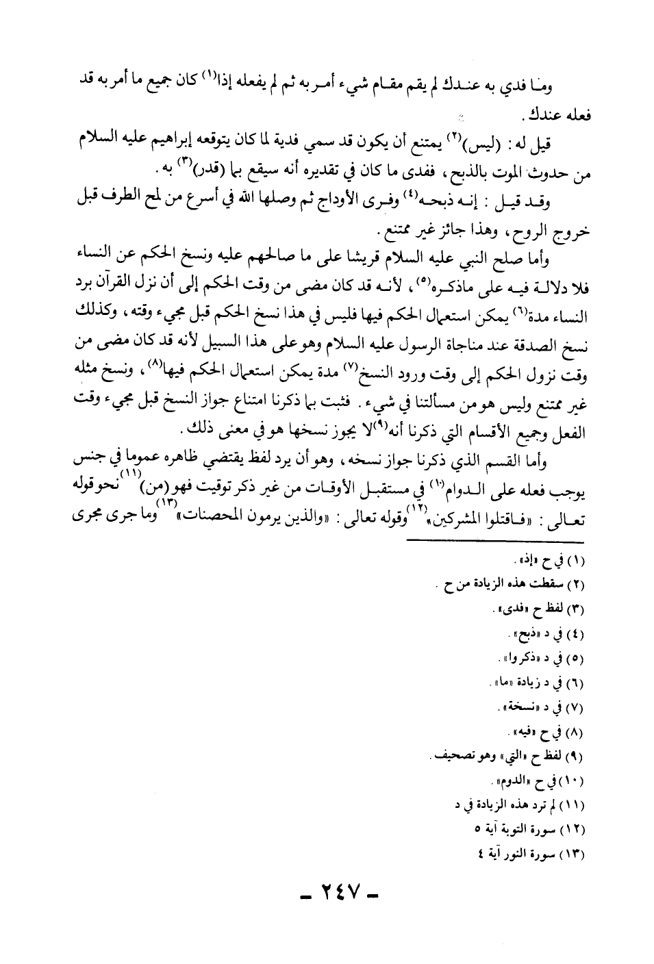 وَأَمَّا الْقِسْمُ الَّذِي ذَكَرْنَا جَوَازَ نَسْخِهِ، وَهُوَ أَنْ يَرِدَ لَفْظٌ يَقْتَضِي ظَاهِرُهُ عُمُومًا فِي جِنْسِ يُوجِبُ فِعْلَهُ عَلَى الدَّوَامِ فِي مُسْتَقْبَلِ الْأَوْقَاتِ مِنْ غَيْرِ ذِكْرِ تَوْقِيتٍ فَهُوَ (مِنْ) نَحْوِ قَوْله تَعَالَى: {فَاقْتُلُوا الْمُشْرِكِينَ} [التوبة: 5] وقَوْله تَعَالَى: {وَاَلَّذِينَ يَرْمُونَ الْمُحْصَنَاتِ} [النور: 4] وَمَا جَرَى مَجْرَى