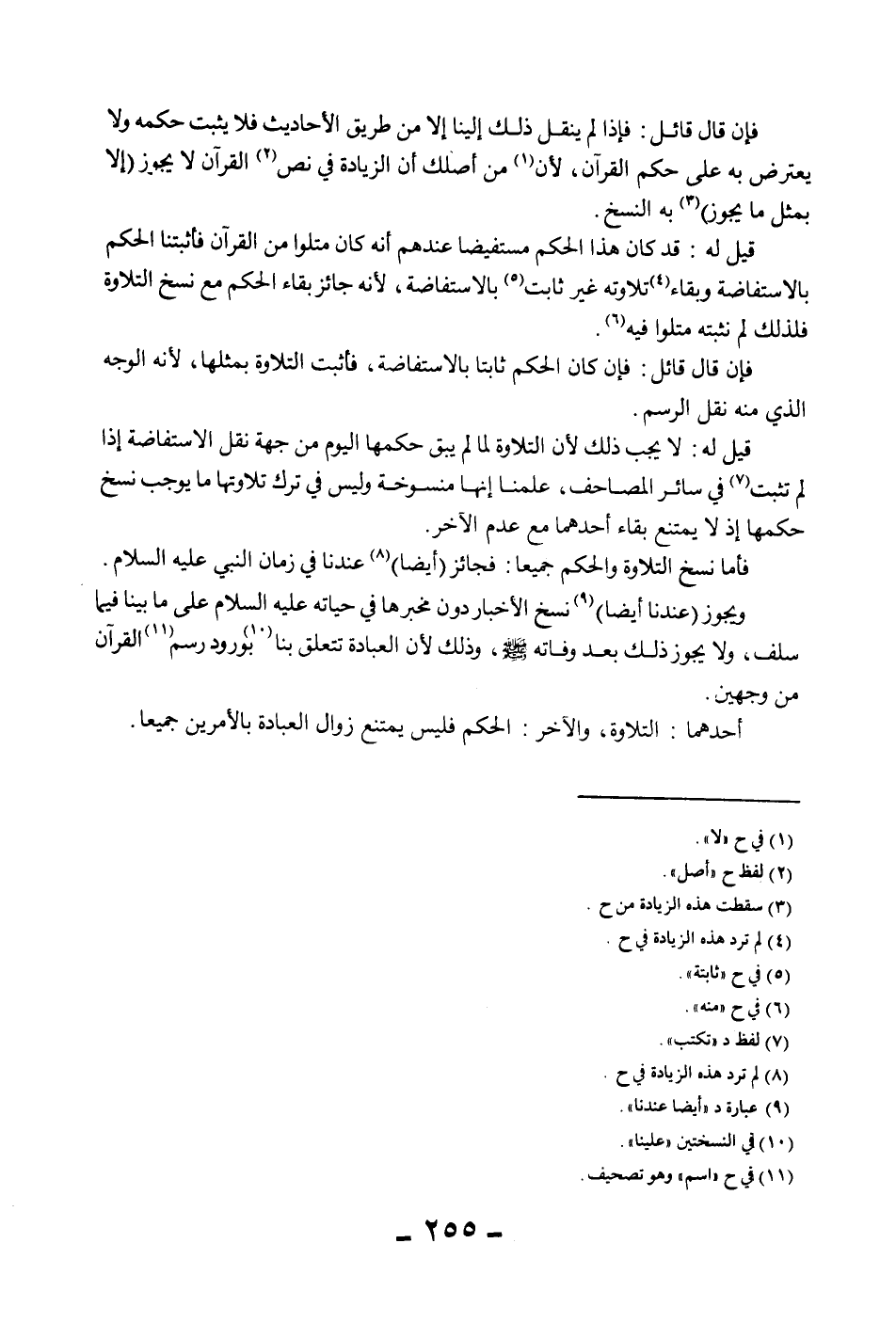 وَيَجُوزُ (عِنْدَنَا أَيْضًا) نَسْخُ الْأَخْبَارِ دُونَ مَخْبَرِهَا فِي حَيَاتِهِ - عَلَيْهِ السَّلَامُ - عَلَى مَا بَيَّنَّا فِيمَا سَلَفَ، وَلَا يَجُوزُ ذَلِكَ بَعْدَ وَفَاتِهِ - صَلَّى اللَّهُ عَلَيْهِ وَسَلَّمَ - وَذَلِكَ لِأَنَّ الْعِبَادَةَ تَتَعَلَّقُ بِنَا بِوُرُودِ رَسْمِ الْقُرْآنِ مِنْ وَجْهَيْنِ.