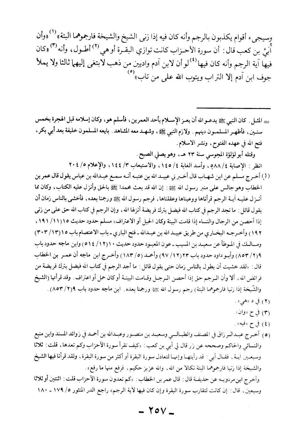 وَسَيَجِيءُ أَقْوَامٌ يُكَذِّبُونَ بِالرَّجْمِ وَأَنَّهُ كَانَ فِيهِ إذَا زَنَى الشَّيْخُ وَالشَّيْخَةُ فَارْجُمُوهُمَا أَلْبَتَّةَ " " وَإِنَّ أُبَيَّ بْنَ كَعْبٍ قَالَ: إنَّ سُورَةَ الْأَحْزَابِ كَانَتْ تُوَازِي الْبَقَرَةَ أَوْ هِيَ أَطْوَلُ، وَأَنَّهُ " كَانَ فِيهَا آيَةُ الرَّجْمِ وَأَنَّهُ كَانَ فِيهَا لَوْ أَنَّ لِابْنِ آدَمَ وَادِيَيْنِ مِنْ ذَهَبٍ لَابْتَغَى إلَيْهِمَا ثَالِثًا وَلَا يَمْلَأُ جَوْفَ ابْنِ آدَمَ إلَّا التُّرَابُ وَيَتُوبُ اللَّهُ عَلَى مَنْ تَابَ "