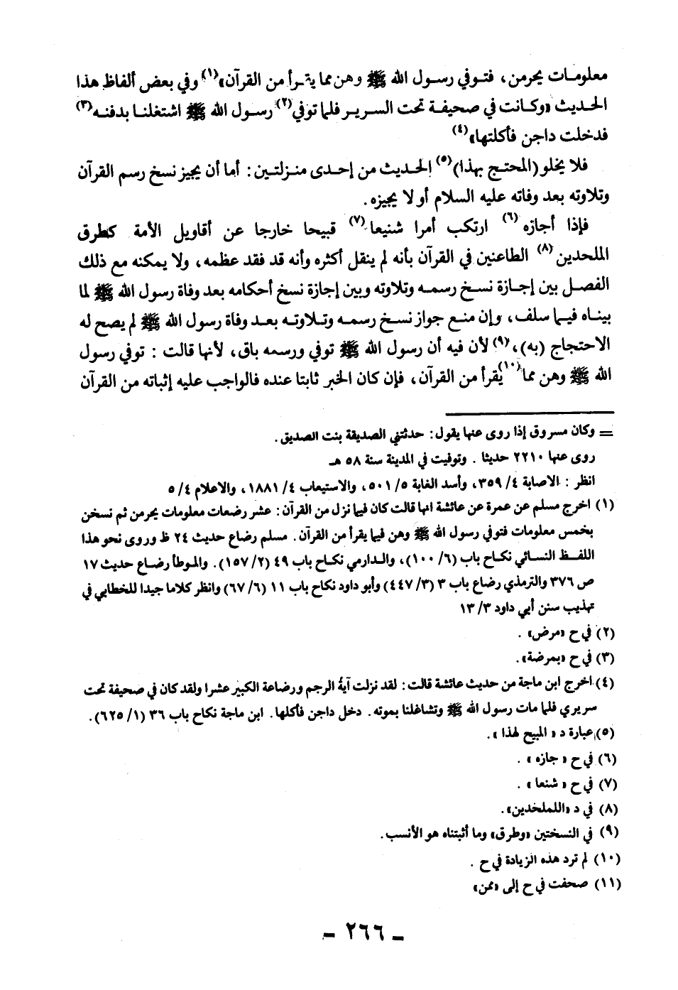 مَعْلُومَاتٍ يُحَرِّمْنَ، فَتُوُفِّيَ رَسُولُ اللَّهِ - صَلَّى اللَّهُ عَلَيْهِ وَسَلَّمَ - وَهُنَّ مِمَّا يُقْرَأُ مِنْ الْقُرْآنِ» وَفِي بَعْضِ أَلْفَاظِ هَذَا الْحَدِيثِ " وَكَانَتْ فِي صَحِيفَةٍ تَحْتَ السَّرِيرِ فَلَمَّا تُوُفِّيَ رَسُولُ اللَّهِ اشْتَغَلْنَا بِدَفْنِهِ فَدَخَلَتْ دَاجِنٌ فَأَكَلَتْهَا " فَلَا يَخْلُو (الْمُحْتَجُّ بِهَذَا) الْحَدِيثِ مِنْ إحْدَى مَنْزِلَتَيْنِ: إمَّا أَنْ يُجِيزَ نَسْخَ رَسْمِ الْقُرْآنِ وَتِلَاوَتِهِ بَعْدَ وَفَاتِهِ - عَلَيْهِ السَّلَامُ - أَوْ لَا يُجِيزَ. فَإِذَا أَجَازَهُ ارْتَكَبَ أَمْرًا شَنِيعًا قَبِيحًا خَارِجًا عَنْ أَقَاوِيلِ الْأُمَّةِ كَطُرُقِ الْمُلْحِدِينَ الطَّاعِنِينَ فِي الْقُرْآنِ بِأَنَّهُ لَمْ يُنْقَلْ أَكْثَرُهُ وَأَنَّهُ قَدْ فُقِدَ عِظَمُهُ، وَلَا يُمْكِنُهُ مَعَ ذَلِكَ الْفَصْلُ بَيْنَ إجَازَةِ نَسْخِ رَسْمِهِ وَتِلَاوَتِهِ وَبَيْنَ إجَازَةِ نَسْخِ أَحْكَامِهِ بَعْدَ وَفَاةِ رَسُولِ اللَّهِ - صَلَّى اللَّهُ عَلَيْهِ وَسَلَّمَ - لِمَا بَيَّنَّاهُ فِيمَا سَلَفَ، وَإِنْ مَنَعَ جَوَازَ نَسْخِ رَسْمِهِ وَتِلَاوَتِهِ بَعْدَ وَفَاةِ رَسُولِ اللَّهِ - صَلَّى اللَّهُ عَلَيْهِ وَسَلَّمَ - لَمْ يَصِحَّ لَهُ الِاحْتِجَاجُ (بِهِ) ، لِأَنَّ فِيهِ أَنَّ رَسُولَ اللَّهِ - صَلَّى اللَّهُ عَلَيْهِ وَسَلَّمَ - تُوُفِّيَ وَرَسْمُهُ بَاقٍ، لِأَنَّهَا قَالَتْ: تُوُفِّيَ رَسُولُ اللَّهِ - صَلَّى اللَّهُ عَلَيْهِ وَسَلَّمَ - وَهُنَّ مِمَّا يُقْرَأُ مِنْ الْقُرْآنِ، فَإِنْ كَانَ الْخَبَرُ ثَابِتًا عِنْدَهُ فَالْوَاجِبُ عَلَيْهِ إثْبَاتُهُ مِنْ الْقُرْآنِ