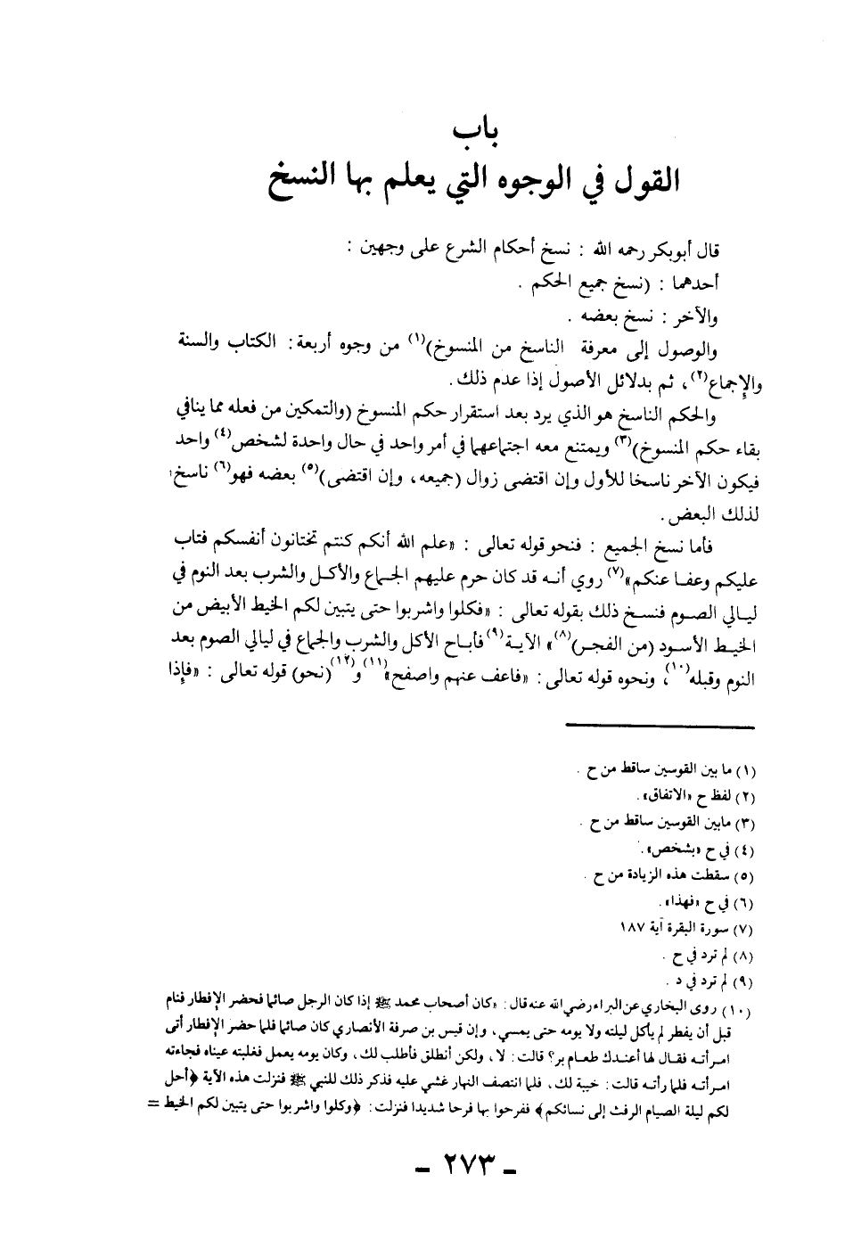 ُ قَالَ أَبُو بَكْرٍ - رَحِمَهُ اللَّهُ -: نَسْخُ أَحْكَامِ الشَّرْعِ عَلَى وَجْهَيْنِ: أَحَدُهُمَا: (نَسْخُ جَمِيعِ الْحُكْمِ. وَالْآخَرُ: نَسْخُ بَعْضِهِ. وَالْوُصُولُ إلَى مَعْرِفَةِ النَّاسِخِ مِنْ الْمَنْسُوخِ)