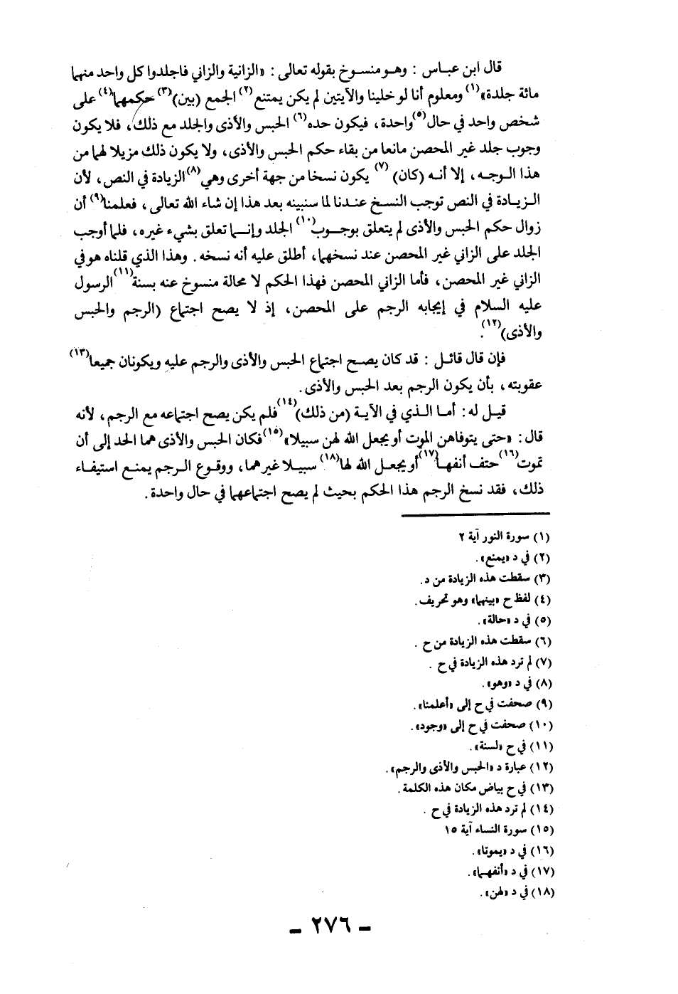 قَالَ ابْنُ عَبَّاسٍ: وَهُوَ مَنْسُوخٌ بِقَوْلِهِ تَعَالَى: {الزَّانِيَةُ وَالزَّانِي فَاجْلِدُوا كُلَّ وَاحِدٍ مِنْهُمَا مِائَةَ جَلْدَةٍ} [النور: 2] وَمَعْلُومٌ أَنَّا لَوْ خَلَّيْنَا وَالْآيَتَيْنِ لَمْ يَكُنْ يَمْتَنِعُ الْجَمْعُ (بَيْنَ) حُكْمِهِمَا عَلَى شَخْصٍ وَاحِدٍ فِي حَالٍ وَاحِدَةٍ، فَيَكُونُ حَدُّهُ الْحَبْسَ وَالْأَذَى وَالْجَلْدَ مَعَ ذَلِكَ، فَلَا يَكُونُ وُجُوبُ جَلْدِ غَيْرِ الْمُحْصَنِ مَانِعًا مِنْ بَقَاءِ حُكْمِ الْحَبْسِ وَالْأَذَى، وَلَا يَكُونُ ذَلِكَ مُزِيلًا لَهُمَا مِنْ هَذَا الْوَجْهِ، إلَّا أَنَّهُ (كَانَ) يَكُونُ نَسْخًا مِنْ جِهَةٍ أُخْرَى وَهِيَ الزِّيَادَةُ فِي النَّصِّ، لِأَنَّ الزِّيَادَةَ فِي النَّصِّ تُوجِبُ النَّسْخَ عِنْدَنَا لِمَا سَنُبَيِّنُهُ بَعْدَ هَذَا إنْ شَاءَ اللَّهُ تَعَالَى، فَعَلِمْنَا أَنَّ زَوَالَ حُكْمِ الْحَبْسِ وَالْأَذَى لَمْ يَتَعَلَّقْ بِوُجُوبِ الْجَلْدِ وَإِنَّمَا تَعَلَّقَ بِشَيْءٍ غَيْرِهِ، فَلَمَّا أَوْجَبَ الْجَلْدَ عَلَى الزَّانِي غَيْرِ الْمُحْصَنِ عِنْدَ نَسْخِهِمَا، أَطْلَقَ عَلَيْهِ أَنَّهُ نَسَخَهُ.