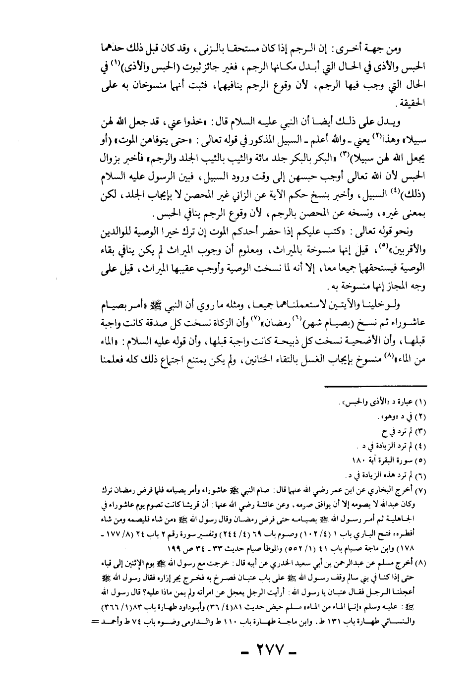 وَيَدُلُّ عَلَى ذَلِكَ أَيْضًا أَنَّ النَّبِيَّ - عَلَيْهِ السَّلَامُ - قَالَ: «خُذُوا عَنِّي، قَدْ جَعَلَ اللَّهُ لَهُنَّ سَبِيلًا» وَهَذَا يَعْنِي - وَاَللَّهُ أَعْلَمُ - السَّبِيلَ الْمَذْكُورَ فِي قَوْله تَعَالَى: {حَتَّى يَتَوَفَّاهُنَّ الْمَوْتُ أَوْ يَجْعَلَ اللَّهُ لَهُنَّ سَبِيلًا} [النساء: 15] «الْبِكْرُ بِالْبِكْرِ جَلْدُ مِائَةٍ وَالثَّيِّبُ بِالثَّيِّبِ الْجَلْدُ وَالرَّجْمُ» فَأَخْبَرَ بِزَوَالِ الْحَبْسِ لِأَنَّ اللَّهَ تَعَالَى أَوْجَبَ حَبْسَهُنَّ إلَى وَقْتِ وُرُودِ السَّبِيلِ، فَبَيَّنَ الرَّسُولُ - عَلَيْهِ السَّلَامُ - (ذَلِكَ) السَّبِيلَ، وَأَخْبَرَ بِنَسْخِ حُكْمِ الْآيَةِ عَنْ الزَّانِي غَيْرِ الْمُحْصَنِ لَا بِإِيجَابِ الْجَلْدِ، لَكِنْ بِمَعْنًى غَيْرِهِ، وَنَسَخَهُ عَنْ الْمُحْصَنِ بِالرَّجْمِ، لِأَنَّ وُقُوعَ الرَّجْمِ يُنَافِي الْحَبْسَ. وَنَحْوُ قَوْله تَعَالَى: {كُتِبَ عَلَيْكُمْ إذَا حَضَرَ أَحَدَكُمْ الْمَوْتُ إنْ تَرَكَ خَيْرًا الْوَصِيَّةُ لِلْوَالِدَيْنِ وَالْأَقْرَبِينَ} [البقرة: 180] ، قِيلَ إنَّهَا مَنْسُوخَةٌ بِالْمِيرَاثِ، وَمَعْلُومٌ أَنَّ وُجُوبَ الْمِيرَاثِ لَمْ يَكُنْ يُنَافِي بَقَاءَ الْوَصِيَّةِ فَيَسْتَحِقُّهَا جَمِيعًا مَعًا، إلَّا أَنَّهُ لَمَّا نُسِخَتْ الْوَصِيَّةُ وَأَوْجَبَ عَقِيبَهَا الْمِيرَاثَ، قِيلَ عَلَى وَجْهِ الْمَجَازِ إنَّهَا مَنْسُوخَةٌ بِهِ. وَلَوْ خُلِّينَا وَالْآيَتَيْنِ لَاسْتَعْمَلْنَاهُمَا جَمِيعًا، وَمِثْلُهُ مَا رُوِيَ «أَنَّ النَّبِيَّ - صَلَّى اللَّهُ عَلَيْهِ وَسَلَّمَ - أَمَرَ بِصِيَامِ عَاشُورَاءَ ثُمَّ نُسِخَ بِصِيَامِ شَهْرِ رَمَضَانَ» وَأَنَّ الزَّكَاةَ نَسَخَتْ كُلَّ صَدَقَةٍ كَانَتْ وَاجِبَةً قَبْلَهَا، وَأَنَّ الْأُضْحِيَّةَ نَسَخَتْ كُلَّ ذَبِيحَةٍ كَانَتْ وَاجِبَةً قَبْلَهَا، وَأَنَّ قَوْلَهُ - عَلَيْهِ السَّلَامُ -: «الْمَاءُ مِنْ الْمَاءِ» مَنْسُوخٌ بِإِيجَابِ الْغُسْلِ بِالْتِقَاءِ الْخِتَانَيْنِ، وَلَمْ يَكُنْ يَمْتَنِعُ اجْتِمَاعُ ذَلِكَ كُلِّهِ فَعَلِمْنَا