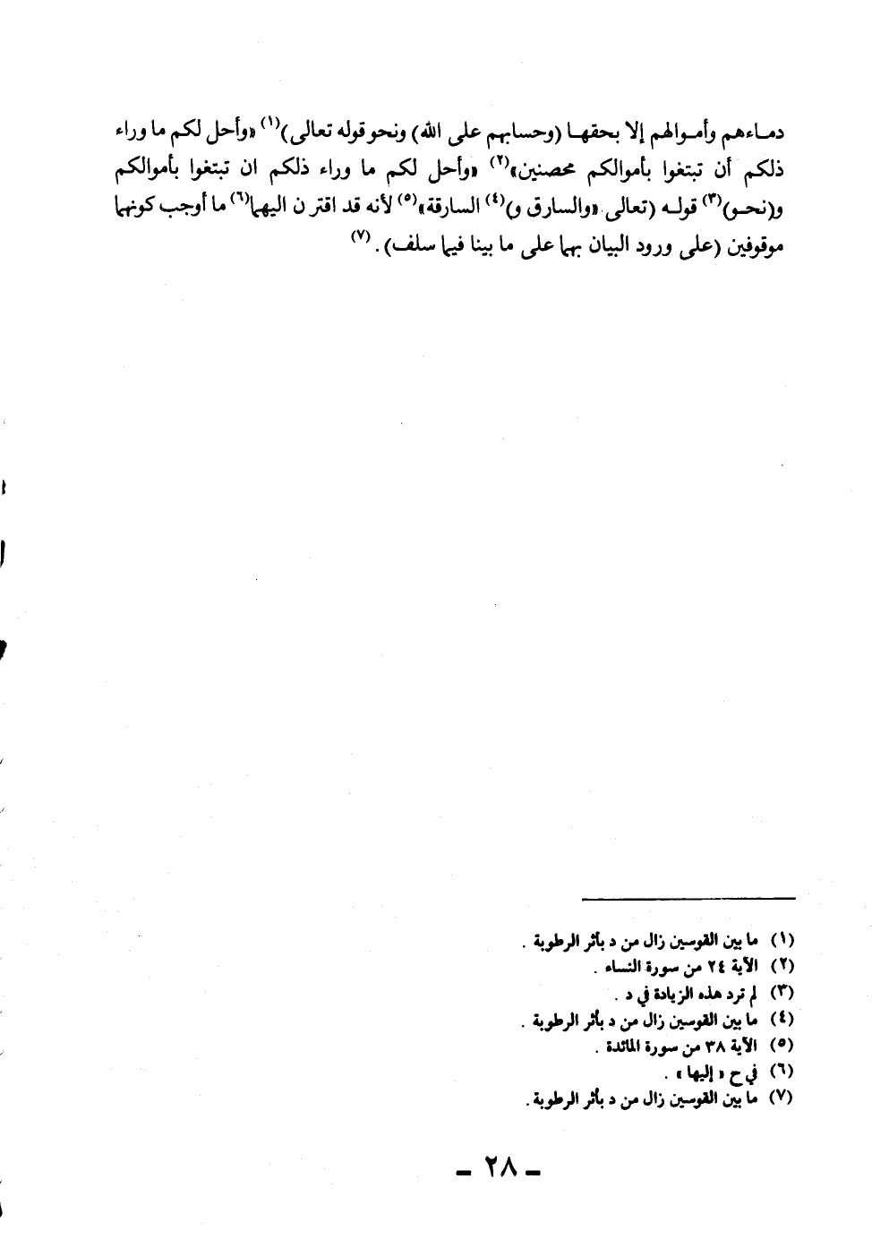 دِمَاءَهُمْ وَأَمْوَالَهُمْ إلَّا بِحَقِّهَا وَحِسَابُهُمْ عَلَى اللَّهِ» (وَنَحْوُ) قَوْله تَعَالَى {وَأُحِلَّ لَكُمْ مَا وَرَاءَ ذَلِكُمْ أَنْ تَبْتَغُوا بِأَمْوَالِكُمْ مُحْصِنِينَ} [النساء: 24] {وَأُحِلَّ لَكُمْ مَا وَرَاءَ ذَلِكُمْ أَنْ تَبْتَغُوا بِأَمْوَالِكُمْ} [النساء: 24] وَ (نَحْوُ) قَوْله تَعَالَى {وَالسَّارِقُ وَالسَّارِقَةُ} [المائدة: 38] لِأَنَّهُ قَدْ اقْتَرَنَ إلَيْهِمَا مَا أَوْجَبَ كَوْنَهُمَا مَوْقُوفَيْنِ (عَلَى وُرُودِ الْبَيَانِ بِهِمَا عَلَى مَا بَيَّنَّا فِيمَا سَلَفَ) .