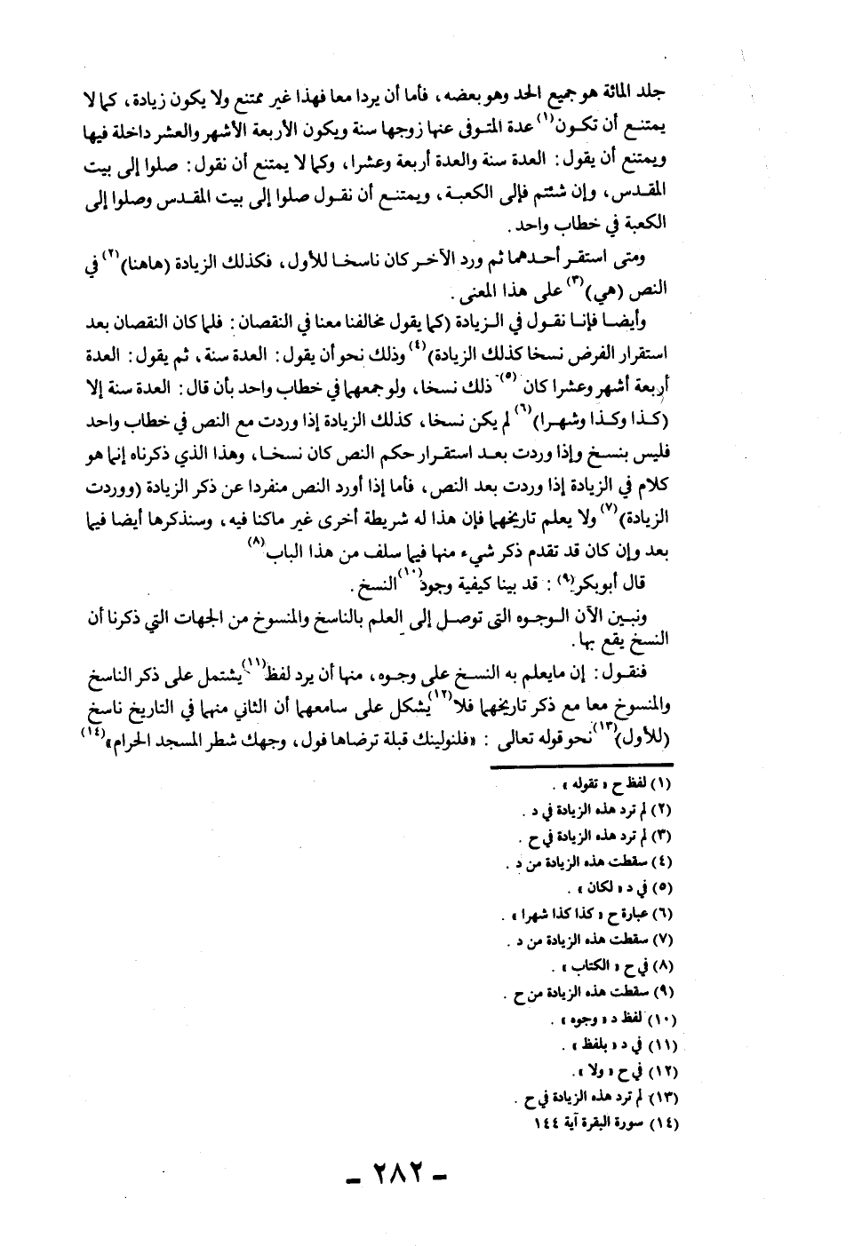 وَمَتَى اسْتَقَرَّ أَحَدُهُمَا ثُمَّ وَرَدَ الْآخَرُ كَانَ نَاسِخًا لِلْأَوَّلِ، فَكَذَلِكَ الزِّيَادَةُ (هَاهُنَا) فِي النَّصِّ (هِيَ) عَلَى هَذَا الْمَعْنَى. وَأَيْضًا فَإِنَّا نَقُولُ فِي الزِّيَادَةِ (كَمَا يَقُولُ مُخَالِفُنَا مَعَنَا فِي النُّقْصَانِ: فَلَمَّا كَانَ النُّقْصَانُ بَعْدَ اسْتِقْرَارِ الْفَرْضِيِّ نَسْخًا كَذَلِكَ الزِّيَادَةُ) وَذَلِكَ نَحْوُ أَنْ يَقُولَ: الْعِدَّةُ سَنَةٌ، ثُمَّ يَقُولُ: الْعِدَّةُ أَرْبَعَةُ أَشْهُرٍ وَعَشْرٌ كَانَ ذَلِكَ نَسْخًا، وَلَوْ جَمَعَهُمَا فِي خِطَابٍ وَاحِدٍ بِأَنْ قَالَ: الْعِدَّةُ سَنَةٌ إلَّا (كَذَا وَكَذَا وَشَهْرًا) لَمْ يَكُنْ نَسْخًا، كَذَلِكَ الزِّيَادَةُ إذَا وَرَدَتْ مَعَ النَّصِّ فِي خِطَابٍ وَاحِدٍ فَلَيْسَ بِنَسْخٍ وَإِذَا وَرَدَتْ بَعْدَ اسْتِقْرَارِ حُكْمِ النَّصِّ كَانَ نَسْخًا، وَهَذَا الَّذِي ذَكَرْنَاهُ إنَّمَا هُوَ كَلَامٌ فِي الزِّيَادَةِ إذَا وَرَدَتْ بَعْدَ النَّصِّ، فَأَمَّا إذَا أُورِدَ النَّصُّ مُنْفَرِدًا عَنْ ذِكْرِ الزِّيَادَةِ (وَوَرَدَتْ الزِّيَادَةُ) وَلَا يُعْلَمُ تَارِيخُهُمَا فَإِنَّ هَذَا لَهُ شَرِيطَةٌ أُخْرَى غَيْرُ مَا كُنَّا فِيهِ، وَسَنَذْكُرُهَا أَيْضًا فِيمَا بَعْدُ وَإِنْ كَانَ قَدْ تَقَدَّمَ ذِكْرُ شَيْءٍ مِنْهَا فِيمَا سَلَفَ مِنْ هَذَا الْبَابِ.