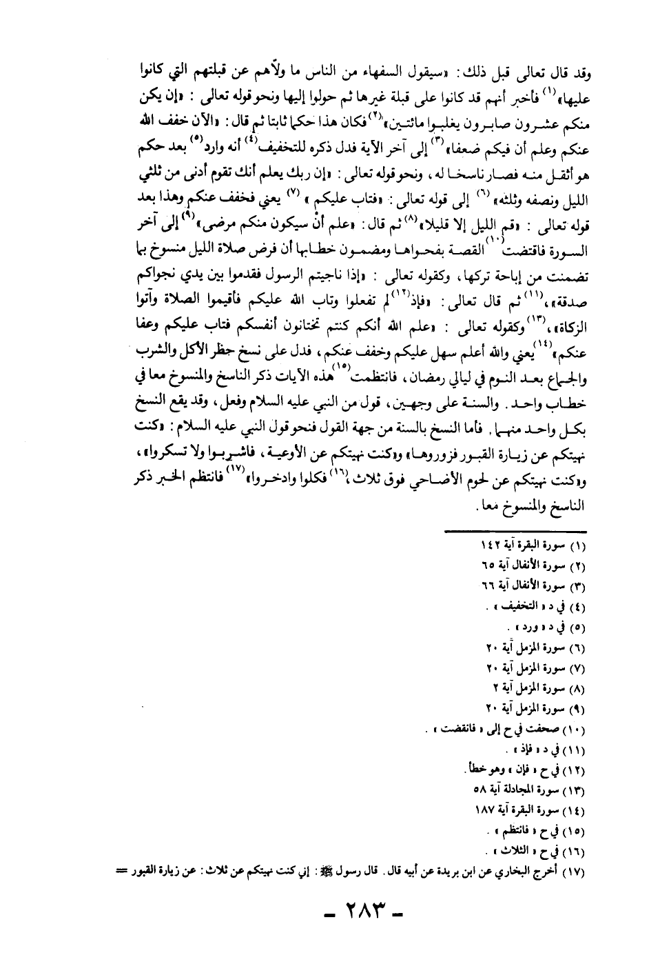 وَقَدْ قَالَ تَعَالَى قَبْلَ ذَلِكَ: {سَيَقُولُ السُّفَهَاءُ مِنْ النَّاسِ مَا وَلَّاهُمْ عَنْ قِبْلَتِهِمْ الَّتِي كَانُوا عَلَيْهَا} [البقرة: 142] فَأَخْبَرَ أَنَّهُمْ قَدْ كَانُوا عَلَى قِبْلَةٍ غَيْرِهَا ثُمَّ حُوِّلُوا إلَيْهَا وَنَحْوُ قَوْله تَعَالَى: {إنْ يَكُنْ مِنْكُمْ عِشْرُونَ صَابِرُونَ يَغْلِبُوا مِائَتَيْنِ} [الأنفال: 65] فَكَانَ هَذَا حُكْمًا ثَابِتًا ثُمَّ قَالَ: {الْآنَ خَفَّفَ اللَّهُ عَنْكُمْ وَعَلِمَ أَنَّ فِيكُمْ ضَعْفًا} [الأنفال: 66] إلَى آخِرِ الْآيَةِ فَدَلَّ ذِكْرُهُ لِلتَّخْفِيفِ أَنَّهُ وَارِدٌ بَعْدَ حُكْمٍ هُوَ أَثْقَلُ مِنْهُ فَصَارَ نَاسِخًا لَهُ، وَنَحْوُ قَوْله تَعَالَى: {إنَّ رَبَّكَ يَعْلَمُ أَنَّكَ تَقُومُ أَدْنَى مِنْ ثُلُثَيْ اللَّيْلِ وَنِصْفَهُ وَثُلُثَهُ} [المزمل: 20] إلَى قَوْله تَعَالَى: {فَتَابَ عَلَيْكُمْ} [المزمل: 20] يَعْنِي فَخَفَّفَ عَنْكُمْ وَهَذَا بَعْدَ قَوْله تَعَالَى: {قُمْ اللَّيْلَ إلَّا قَلِيلًا} [المزمل: 2] ثُمَّ قَالَ: {عَلِمَ أَنْ سَيَكُونُ مِنْكُمْ مَرْضَى} [المزمل: 20] إلَى آخِرِ السُّورَةِ فَاقْتَضَتْ الْقِصَّةُ بِفَحْوَاهَا وَمَضْمُونِ خِطَابِهَا أَنَّ فَرْضَ صَلَاةِ اللَّيْلِ مَنْسُوخٌ بِمَا تَضَمَّنَتْ مِنْ إبَاحَةِ تَرْكِهَا، وَكَقَوْلِهِ تَعَالَى: {إذَا نَاجَيْتُمْ الرَّسُولَ فَقَدِّمُوا بَيْنَ يَدَيْ نَجْوَاكُمْ صَدَقَةً} [المجادلة: 12] ثُمَّ قَالَ تَعَالَى: {فَإِذْ لَمْ تَفْعَلُوا وَتَابَ اللَّهُ عَلَيْكُمْ فَأَقِيمُوا الصَّلَاةَ وَآتُوا الزَّكَاةَ} [المجادلة: 13] ، وَكَقَوْلِهِ تَعَالَى: {عَلِمَ اللَّهُ أَنَّكُمْ كُنْتُمْ تَخْتَانُونَ أَنْفُسَكُمْ فَتَابَ عَلَيْكُمْ وَعَفَا عَنْكُمْ} [البقرة: 187] يَعْنِي - وَاَللَّهُ أَعْلَمُ - سَهَّلَ عَلَيْكُمْ وَخَفَّفَ عَنْكُمْ، فَدَلَّ عَلَى نَسْخِ حَظْرِ الْأَكْلِ وَالشُّرْبِ وَالْجِمَاعِ بَعْدَ النَّوْمِ فِي لَيَالِي رَمَضَانَ، فَانْتَظَمَتْ هَذِهِ الْآيَاتُ ذِكْرَ النَّاسِخِ وَالْمَنْسُوخِ مَعًا فِي خِطَابٍ وَاحِدٍ.