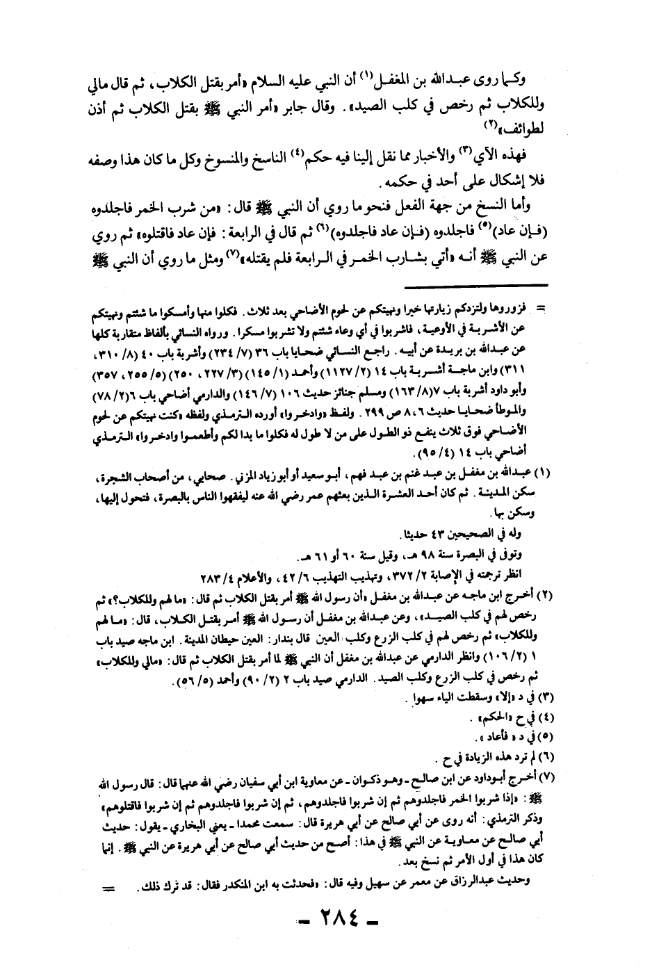وَكَمَا رَوَى عَبْدُ اللَّهِ بْنُ الْمُغَفَّلِ «أَنَّ النَّبِيَّ - عَلَيْهِ السَّلَامُ - أَمَرَ بِقَتْلِ الْكِلَابِ، ثُمَّ قَالَ مَالِي وَلِلْكِلَابِ ثُمَّ رَخَّصَ فِي كَلْبِ الصَّيْدِ» . وَقَالَ جَابِرٌ «أَمَرَ النَّبِيُّ - صَلَّى اللَّهُ عَلَيْهِ وَسَلَّمَ - بِقَتْلِ الْكِلَابِ ثُمَّ أَذِنَ لِطَوَائِفَ» فَهَذِهِ الْآيَةُ وَالْأَخْبَارُ مِمَّا نُقِلَ إلَيْنَا فِيهِ حُكْمُ النَّاسِخِ وَالْمَنْسُوخِ وَكُلُّ مَا كَانَ هَذَا وَصْفَهُ فَلَا إشْكَالَ عَلَى أَحَدٍ فِي حُكْمِهِ.