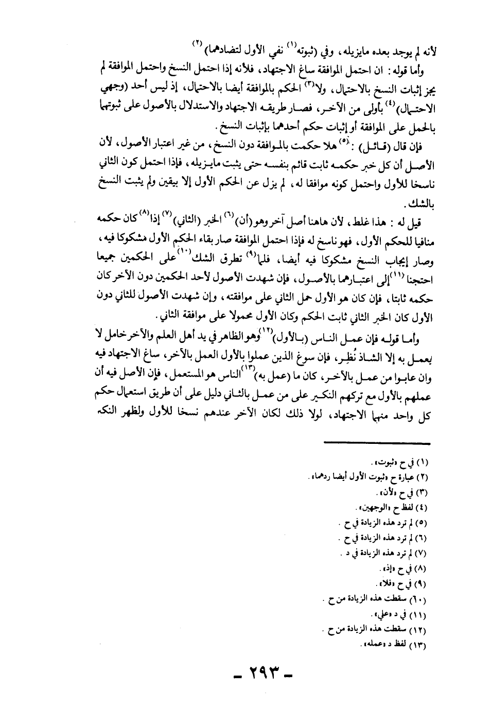 لِأَنَّهُ لَمْ يُوجَدْ بَعْدَهُ مَا يُزِيلُهُ، وَفِي (ثُبُوتِهِ نَفْيُ الْأَوَّلِ لِتَضَادِّهِمَا) وَأَمَّا قَوْلُهُ: إنْ احْتَمَلَ الْمُوَافَقَةَ سَاغَ الِاجْتِهَادُ، فَلِأَنَّهُ إذَا احْتَمَلَ النَّسْخَ وَاحْتَمَلَ الْمُوَافَقَةَ لَمْ يَجُزْ إثْبَاتُ النَّسْخِ بِالِاحْتِمَالِ، وَلَا الْحُكْمِ بِالْمُوَافَقَةِ أَيْضًا بِالِاحْتِمَالِ، إذْ لَيْسَ أَحَدُ (وَجْهَيْ الِاحْتِمَالِ) بِأَوْلَى مِنْ الْآخَرِ، فَصَارَ طَرِيقُهُ الِاجْتِهَادَ وَالِاسْتِدْلَالَ بِالْأُصُولِ عَلَى ثُبُوتِهِمَا بِالْحَمْلِ عَلَى الْمُوَافَقَةِ أَوْ إثْبَاتُ حُكْمِ أَحَدِهِمَا بِإِثْبَاتِ النَّسْخِ.