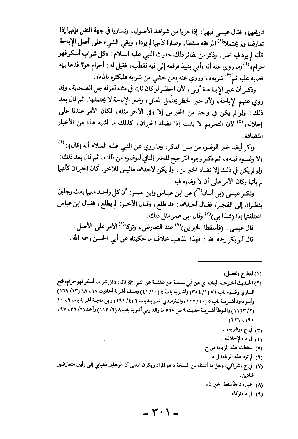 تَارِيخَهُمَا، فَقَالَ عِيسَى فِيهِمَا: إذَا عَرِيَا مِنْ شَوَاهِدِ الْأُصُولِ، وَتَسَاوَيَا فِي جِهَةِ النَّقْلِ فَإِنَّهُمَا إذَا تَعَارَضَا وَلَمْ يَحْتَمِلَا الْمُوَافَقَةَ سَقَطَا، وَصَارَا كَأَنَّهُمَا لَمْ يَرِدَا، وَبَقِيَ الشَّيْءُ عَلَى أَصْلِ الْإِبَاحَةِ كَأَنَّهُ لَمْ يَرِدْ فِيهِ خَبَرٌ. وَذَكَرَ مِنْ نَظَائِرِ ذَلِكَ حَدِيثَ النَّبِيِّ - عَلَيْهِ السَّلَامُ -: «كُلُّ شَرَابٍ أَسْكَرَ فَهُوَ حَرَامٌ» وَمَا رُوِيَ عَنْهُ أَنَّهُ «أُتِيَ بِنَبِيذٍ فَرَفَعَهُ إلَى فِيهِ فَقَطَّبَ، فَقِيلَ لَهُ: أَحَرَامٌ هُوَ؟ فَدَعَا بِمَاءٍ فَصَبَّهُ عَلَيْهِ ثُمَّ شَرِبَهُ» .