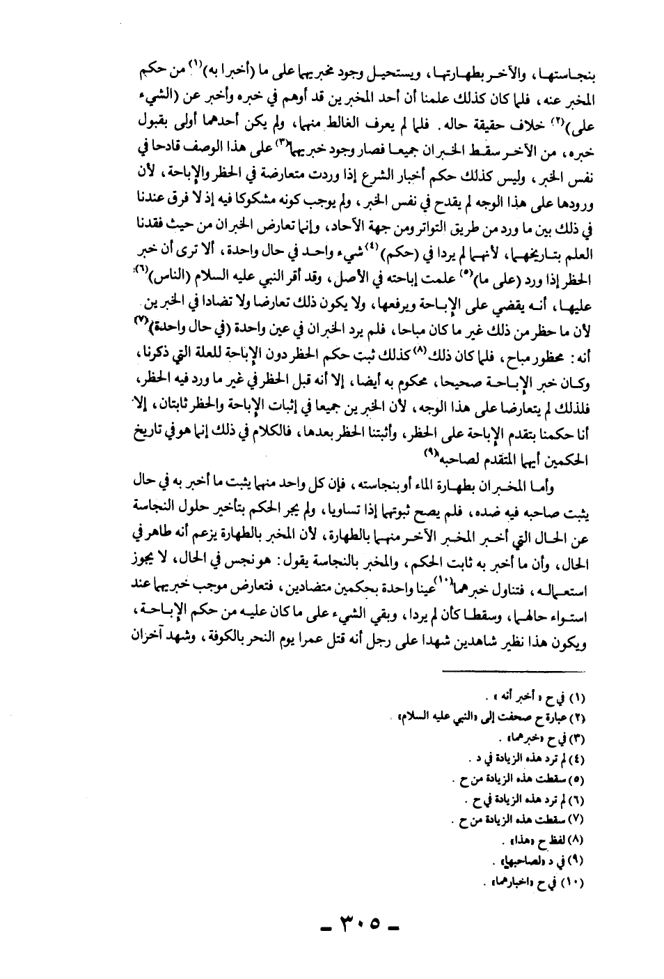 بِنَجَاسَتِهَا، وَالْآخَرُ بِطَهَارَتِهَا، وَيَسْتَحِيلُ وُجُودُ مُخْبِرِيهِمَا عَلَى مَا (أَخْبَرَا بِهِ) مِنْ حُكْمِ الْمَخْبَرِ عَنْهُ، فَلَمَّا كَانَ كَذَلِكَ عَلِمْنَا أَنَّ أَحَدَ الْمُخْبِرَيْنِ قَدْ أَوْهَمَ فِي خَبَرِهِ وَأَخْبَرَ عَنْ (الشَّيْءِ عَلَى) خِلَافِ حَقِيقَةِ حَالِهِ. فَلَمَّا لَمْ يَعْرِفْ الْغَالِطَ مِنْهُمَا، وَلَمْ يَكُنْ أَحَدُهُمَا أَوْلَى بِقَبُولِ خَبَرِهِ، مِنْ الْآخَرِ سَقَطَ الْخَبَرَانِ جَمِيعًا فَصَارَ وُجُودُ خَبَرَيْهِمَا عَلَى هَذَا الْوَصْفِ قَادِحًا فِي نَفْسِ الْخَبَرِ، وَلَيْسَ كَذَلِكَ حُكْمُ أَخْبَارِ الشَّرْعِ إذَا وَرَدَتْ مُتَعَارِضَةً فِي الْحَظْرِ وَالْإِبَاحَةِ، لِأَنَّ وُرُودَهَا عَلَى هَذَا الْوَجْهِ لَمْ يَقْدَحْ فِي نَفْسِ الْخَبَرِ، وَلَمْ يُوجِبْ كَوْنَهُ مَشْكُوكًا فِيهِ إذْ لَا فَرْقَ عِنْدَنَا فِي ذَلِكَ بَيْنَ مَا وَرَدَ مِنْ طَرِيقِ التَّوَاتُرِ وَمِنْ جِهَةِ الْآحَادِ، وَإِنَّمَا تَعَارَضَ الْخَبَرَانِ مِنْ حَيْثُ فَقَدْنَا الْعِلْمَ بِتَارِيخِهِمَا، لِأَنَّهُمَا لَمْ يَرِدَا فِي (حُكْمِ) شَيْءٍ وَاحِدٍ فِي حَالٍ وَاحِدَةٍ.