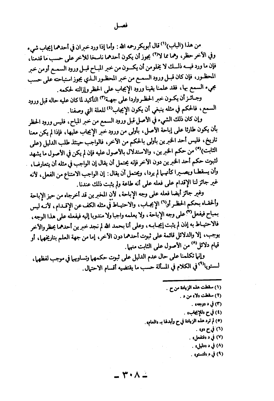 فَصْلٌ مِنْ هَذَا (الْبَابِ) قَالَ أَبُو بَكْرٍ - رَحِمَهُ اللَّهُ -: وَأَمَّا إذَا وَرَدَ خَبَرَانِ فِي أَحَدِهِمَا إيجَابُ شَيْءٍ وَفِي الْآخَرِ حَظْرٌ، وَهُمَا مِمَّا لَا يَجُوزُ أَنْ يَكُونَ أَحَدُهُمَا نَاسِخًا لِلْآخَرِ عَلَى حَسَبِ مَا قَدَّمْنَا، فَإِنَّ مَا وَرَدَ فِيهِ ذَلِكَ لَا يَخْلُو مِنْ أَنْ يَكُونَ مِنْ خَبَرِ الْمُبَاحِ قَبْلَ وُرُودِ السَّمْعِ أَوْ مِنْ خَبَرِ الْمَحْظُورِ، فَإِنْ كَانَ قَبْلَ وُرُودِ السَّمْعِ مِنْ خَبَرِ الْمَحْظُورِ الَّذِي يَجُوزُ اسْتِبَاحَتُهُ عَلَى حَسَبِ مَجِيءِ السَّمْعِ بِهَا، فَقَدْ عَلِمْنَا يَقِينًا وُرُودَ الْإِيجَابِ عَلَى الْحَظْرِ وَإِزَالَتَهُ لِحُكْمِهِ. وَجَائِزٌ أَنْ يَكُونَ خَبَرُ الْحَظْرِ وَارِدًا عَلَى جِهَةِ التَّأْكِيدِ لِمَا كَانَ عَلَيْهِ حَالُهُ قَبْلَ وُرُودِ السَّمْعِ، فَالْحُكْمُ فِي مِثْلِهِ يَنْبَغِي أَنْ يَكُونَ الْإِيجَابَ لِلْعِلَّةِ الَّتِي وَصَفْنَا.