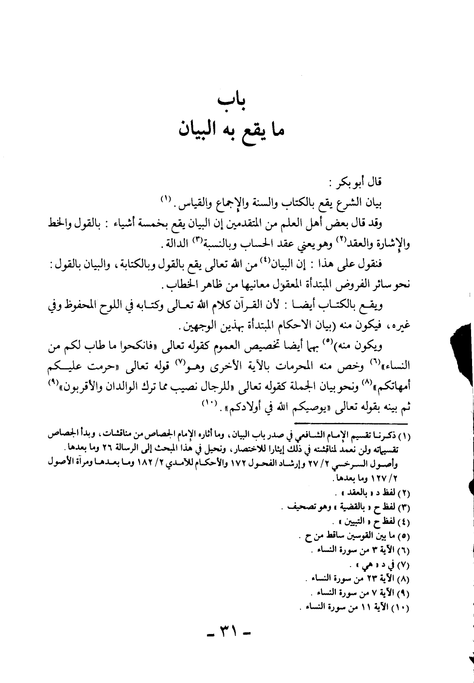 ُ قَالَ أَبُو بَكْرٍ: بَيَانُ الشَّرْعِ يَقَعُ بِالْكِتَابِ وَالسُّنَّةِ وَالْإِجْمَاعِ وَالْقِيَاسِ. وَقَدْ قَالَ بَعْضُ أَهْلِ الْعِلْمِ مِنْ الْمُتَقَدِّمِينَ إنَّ الْبَيَانَ يَقَعُ بِخَمْسَةِ أَشْيَاءَ: بِالْقَوْلِ وَالْخَطِّ وَالْإِشَارَةِ وَالْعَقْدِ وَهُوَ يَعْنِي عَقْدَ الْحِسَابِ وَبِالنِّسْبَةِ الدَّالَّةِ. فَنَقُولُ عَلَى هَذَا: إنَّ الْبَيَانَ مِنْ اللَّهِ تَعَالَى يَقَعُ بِالْقَوْلِ وَبِالْكِتَابَةِ، وَالْبَيَانُ بِالْقَوْلِ: نَحْوُ سَائِرِ الْفُرُوضِ الْمُبْتَدَأَةِ الْمَعْقُولِ مَعَانِيهَا مِنْ ظَاهِرِ الْخِطَابِ. وَيَقَعُ بِالْكِتَابِ أَيْضًا: لِأَنَّ الْقُرْآنَ كَلَامُ اللَّهِ تَعَالَى وَكِتَابُهُ فِي اللَّوْحِ الْمَحْفُوظِ وَفِي غَيْرِهِ، فَيَكُونُ مِنْهُ (بَيَانُ الْأَحْكَامِ الْمُبْتَدَأَةِ بِهَذَيْنِ الْوَجْهَيْنِ. وَيَكُونُ مِنْهُ) بِهِمَا أَيْضًا تَخْصِيصُ الْعُمُومِ كَقَوْلِهِ تَعَالَى {فَانْكِحُوا مَا طَابَ لَكُمْ مِنْ النِّسَاءِ} [النساء: 3] وَخَصَّ مِنْهُ الْمُحَرَّمَاتِ بِالْآيَةِ الْأُخْرَى وَهُوَ قَوْله تَعَالَى {حُرِّمَتْ عَلَيْكُمْ أُمَّهَاتُكُمْ} [النساء: 23] وَنَحْوُ بَيَانِ الْجُمْلَةِ كَقَوْلِهِ تَعَالَى {لِلرِّجَالِ نَصِيبٌ مِمَّا تَرَكَ الْوَالِدَانِ وَالْأَقْرَبُونَ} [النساء: 7] ثُمَّ بَيَّنَهُ بِقَوْلِهِ تَعَالَى {يُوصِيكُمْ اللَّهُ فِي أَوْلَادِكُمْ} [النساء: 11] .