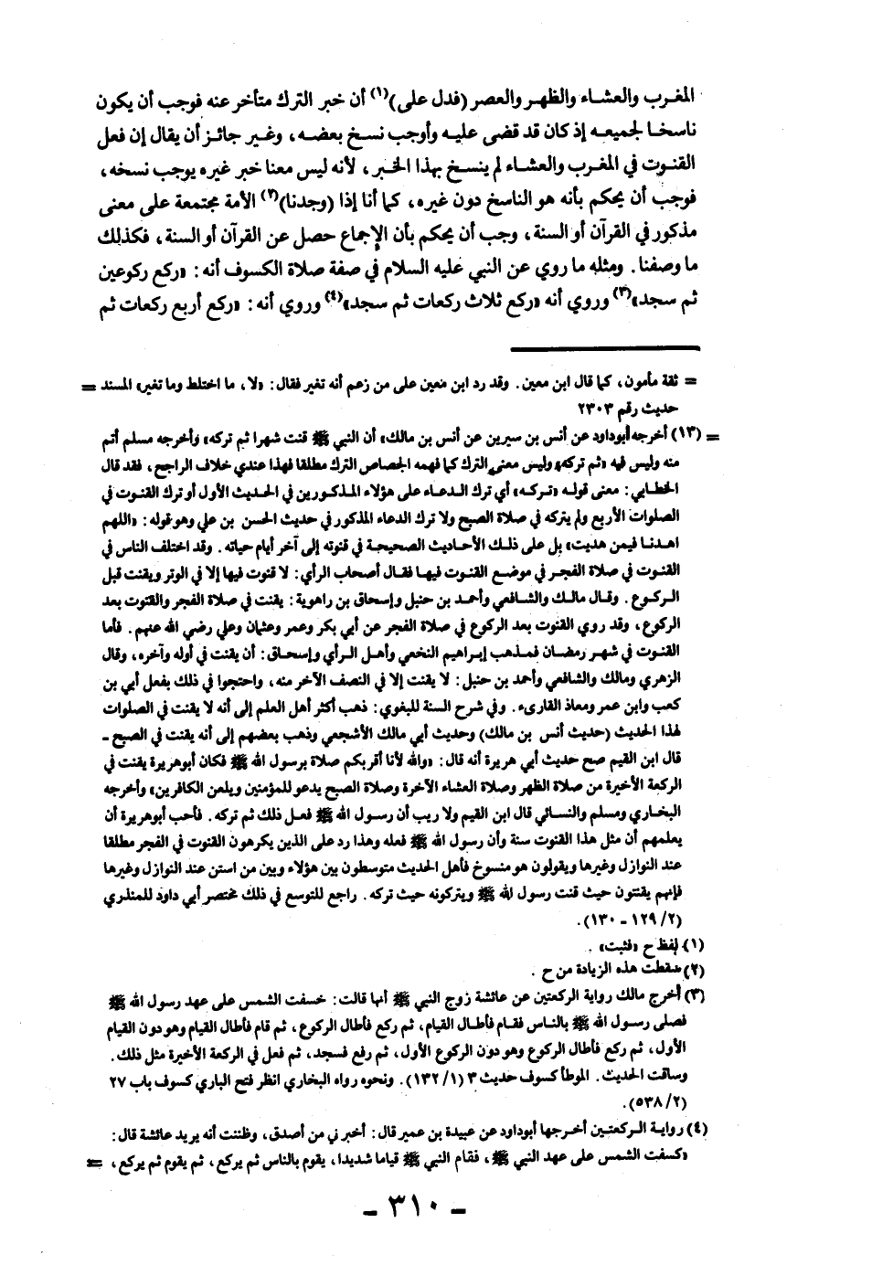 الْمَغْرِبِ وَالْعِشَاءِ وَالظُّهْرِ وَالْعَصْرِ (فَدَلَّ عَلَى) أَنَّ خَبَرَ التَّرْكِ مُتَأَخِّرٌ عَنْهُ فَوَجَبَ أَنْ يَكُونَ نَاسِخًا لِجَمِيعِهِ إذْ كَانَ قَدْ قَضَى عَلَيْهِ وَأَوْجَبَ نَسْخَ بَعْضِهِ، وَغَيْرُ جَائِزٍ أَنْ يُقَالَ إنَّ فِعْلَ الْقُنُوتِ فِي الْمَغْرِبِ وَالْعِشَاءِ لَمْ يُنْسَخْ بِهَذَا الْخَبَرِ، لِأَنَّهُ لَيْسَ مَعَنَا خَبَرٌ غَيْرُهُ يُوجِبُ نَسْخَهُ، فَوَجَبَ أَنْ يَحْكُمَ بِأَنَّهُ هُوَ النَّاسِخُ دُونَ غَيْرِهِ، كَمَا أَنَّا إذَا (وَجَدْنَا) الْأُمَّةَ مُجْتَمِعَةً عَلَى مَعْنًى مَذْكُورٍ فِي الْقُرْآنِ أَوْ السُّنَّةِ، وَجَبَ أَنْ يُحْكَمَ بِأَنَّ الْإِجْمَاعَ حَصَلَ عَنْ الْقُرْآنِ أَوْ السُّنَّةِ، فَكَذَلِكَ مَا وَصَفْنَا. وَمِثْلُ مَا رُوِيَ «عَنْ النَّبِيِّ - عَلَيْهِ السَّلَامُ - فِي صِفَةِ صَلَاةِ الْكُسُوفِ أَنَّهُ: رَكَعَ رُكُوعَيْنِ ثُمَّ سَجَدَ» وَرُوِيَ أَنَّهُ «رَكَعَ ثَلَاثَ رَكَعَاتٍ ثُمَّ سَجَدَ» وَرُوِيَ أَنَّهُ: «رَكَعَ أَرْبَعَ رَكَعَاتٍ ثُمَّ