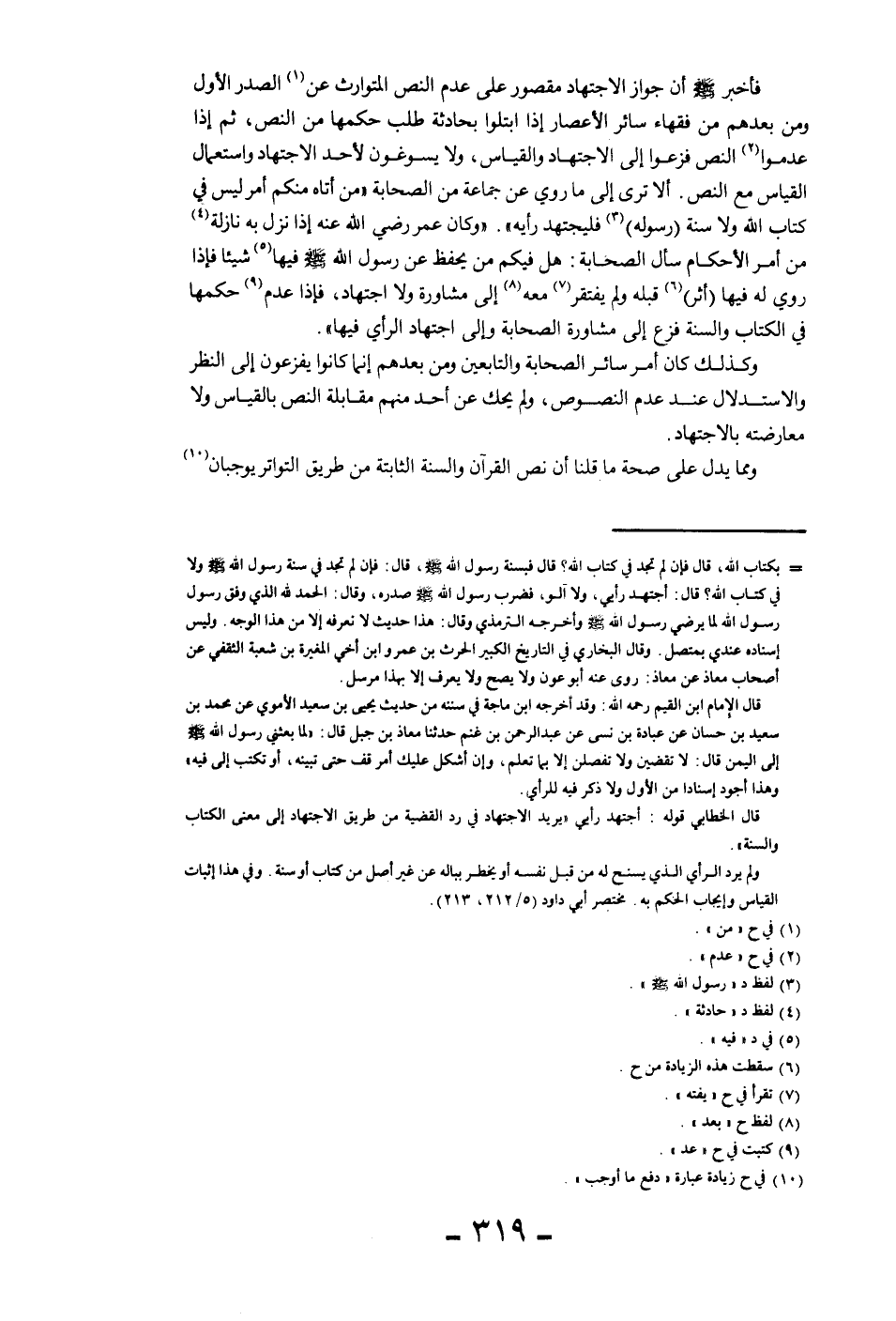 فَأَخْبَرَ - صَلَّى اللَّهُ عَلَيْهِ وَسَلَّمَ - أَنَّ جَوَازَ الِاجْتِهَادِ مَقْصُورٌ عَلَى عَدَمِ النَّصِّ الْمُتَوَارَثِ عَنْ الصَّدْرِ الْأَوَّلِ وَمَنْ بَعْدَهُمْ مِنْ فُقَهَاءِ سَائِرِ الْأَعْصَارِ إذَا اُبْتُلُوا بِحَادِثَةٍ طَلَبَ حُكْمَهَا مِنْ النَّصِّ، ثُمَّ إذَا عَدِمُوا النَّصَّ فَزِعُوا إلَى الِاجْتِهَادِ وَالْقِيَاسِ، وَلَا يُسَوِّغُونَ لِأَحَدٍ الِاجْتِهَادَ وَاسْتِعْمَالَ الْقِيَاسِ مَعَ النَّصِّ.