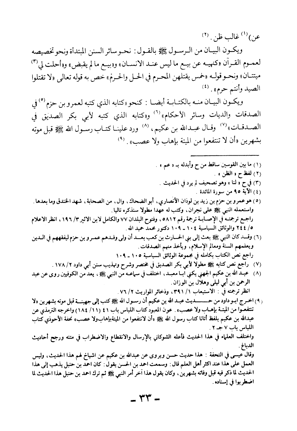 وَيَكُونُ الْبَيَانُ مِنْهُ بِالْكِتَابَةِ أَيْضًا: كَنَحْوِ " كِتَابِهِ الَّذِي كَتَبَهُ لِعَمْرِو بْنِ حَزْمٍ فِي الصَّدَقَاتِ وَالدِّيَاتِ وَسَائِرِ الْأَحْكَامِ "، وَ " كِتَابِهِ الَّذِي كَتَبَهُ لِأَبِي بَكْرٍ الصِّدِّيقِ فِي الصَّدَقَاتِ " وَقَالَ عَبْدُ اللَّهِ بْنُ حَكِيمٍ، وَرَدَ عَلَيْنَا كِتَابُ رَسُولِ اللَّهِ - صَلَّى اللَّهُ عَلَيْهِ وَسَلَّمَ - قَبْلَ مَوْتِهِ بِشَهْرَيْنِ «أَنْ لَا تَنْتَفِعُوا مِنْ الْمَيْتَةِ بِإِهَابٍ وَلَا عَصَبٍ» .