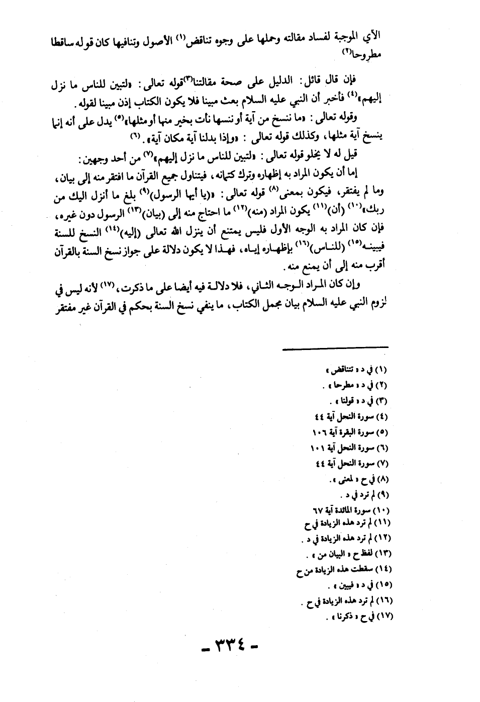 قِيلَ لَهُ لَا يَخْلُو قَوْله تَعَالَى: {لِتُبَيِّنَ لِلنَّاسِ مَا نُزِّلَ إلَيْهِمْ} [النحل: 44] مِنْ أَحَدِ وَجْهَيْنِ: إمَّا أَنْ يَكُونَ الْمُرَادُ بِهِ إظْهَارَهُ وَتَرْكَ كِتْمَانِهِ، فَيَتَنَاوَلُ جَمِيعَ الْقُرْآنِ مَا افْتَقَرَ مِنْهُ إلَى بَيَانٍ، وَمَا لَمْ يَفْتَقِرْ، فَيَكُونُ بِمَعْنَى قَوْله تَعَالَى: {يَا أَيُّهَا الرَّسُولُ بَلِّغْ مَا أُنْزِلَ إلَيْك مِنْ رَبِّك} [المائدة: 67] (أَنْ) يَكُونَ الْمُرَادُ (مِنْهُ) مَا احْتَاجَ مِنْهُ إلَى (بَيَانِ) الرَّسُولِ دُونَ غَيْرِهِ، فَإِنْ كَانَ الْمُرَادُ بِهِ الْوَجْهَ الْأَوَّلَ فَلَيْسَ يَمْتَنِعُ أَنْ يُنَزِّلَ اللَّهُ تَعَالَى (إلَيْهِ) النَّسْخَ لِلسُّنَّةِ فَيُبَيِّنُهُ (لِلنَّاسِ) بِإِظْهَارِهِ إيَّاهُ، فَهَذَا لَا يَكُونُ دَلَالَةً عَلَى جَوَازِ نَسْخِ السُّنَّةِ بِالْقُرْآنِ أَقْرَبَ مِنْهُ إلَى أَنْ يَمْنَعَ مِنْهُ.