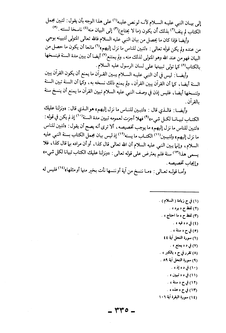 وَأَيْضًا: فَاَلَّذِي قَالَ: {لِتُبَيِّنَ لِلنَّاسِ مَا نُزِّلَ إلَيْهِمْ} [النحل: 44] هُوَ الَّذِي قَالَ: {وَنَزَّلْنَا عَلَيْك الْكِتَابَ تِبْيَانًا لِكُلِّ شَيْءٍ} [النحل: 89] فَهَلَّا أَجَزْت لِعُمُومِهِ تَبْيِينَ مُدَّةِ السُّنَّةِ إذْ لَمْ يَكُنْ فِي قَوْلِهِ: {لِتُبَيِّنَ لِلنَّاسِ مَا نُزِّلَ إلَيْهِمْ} [النحل: 44] مَا يُوجِبُ تَخْصِيصَهُ، أَلَا تَرَى أَنَّهُ يَصِحُّ أَنْ يَقُولَ: {لِتُبَيِّنَ لِلنَّاسِ مَا نُزِّلَ إلَيْهِمْ} [النحل: 44] وَلِتُبَيِّنَ الْكِتَابَ مَا بِسُنَّةٍ إذْ لَيْسَ بَيَانُ مُجْمَلِ الْكِتَابِ بِسُنَّةِ النَّبِيِّ - عَلَيْهِ السَّلَامُ - وَإِنَّمَا يُبَيِّنُ النَّبِيُّ - عَلَيْهِ السَّلَامُ - أَنَّ اللَّهَ تَعَالَى قَالَ كَذَا، أَوْ أَنَّ مُرَادَهُ بِمَا قَالَ كَذَا، فَلَا يُسَمَّى هَذَا سُنَّةً فَلَمْ يَعْتَرِضْ عَلَى قَوْله تَعَالَى: {وَنَزَّلْنَا عَلَيْك الْكِتَابَ تِبْيَانًا لِكُلِّ شَيْءٍ} [النحل: 89] وَإِيجَابُ تَخْصِيصِهِ.