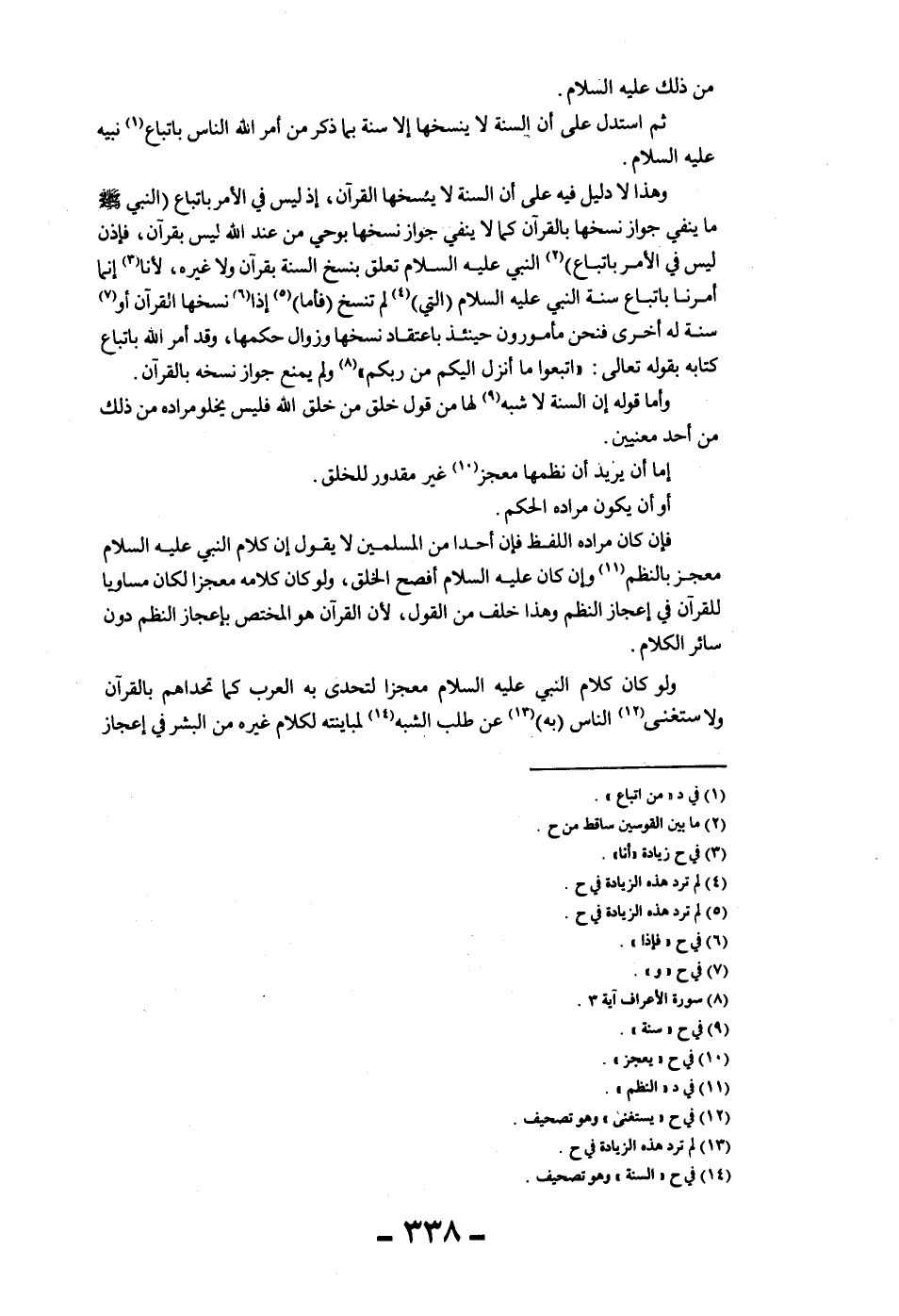 وَلَوْ كَانَ كَلَامُ النَّبِيِّ - عَلَيْهِ السَّلَامُ - مُعْجِزًا لَتَحَدَّى بِهِ الْعَرَبَ كَمَا تَحَدَّاهُمْ بِالْقُرْآنِ وَلَاسْتَغْنَى النَّاسُ (بِهِ) عَنْ طَلَبِ الشَّبَهِ لِمُبَايِنَتِهِ لِكَلَامِ غَيْرِهِ مِنْ الْبَشَرِ فِي إعْجَازِ