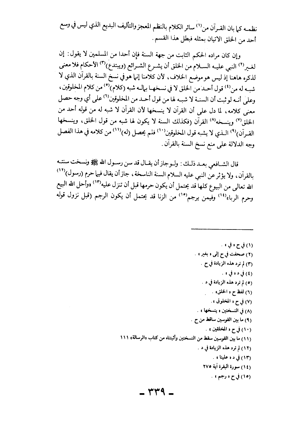 قَالَ الشَّافِعِيُّ بَعْدَ ذَلِكَ: وَلَوْ جَازَ أَنْ يُقَالَ قَدْ سَنَّ رَسُولُ اللَّهِ - صَلَّى اللَّهُ عَلَيْهِ وَسَلَّمَ - وَنُسِخَتْ سُنَّتُهُ بِالْقُرْآنِ، وَلَا يُؤْثَرُ عَنْ النَّبِيِّ - عَلَيْهِ السَّلَامُ - السُّنَّةُ النَّاسِخَةُ، جَازَ أَنْ يُقَالَ فِيمَا حَرَّمَ (رَسُولُ) اللَّهِ تَعَالَى مِنْ الْبُيُوعِ كُلِّهَا قَدْ يُحْتَمَلُ أَنْ يَكُونَ حَرَّمَهَا قَبْلَ أَنْ تَنْزِلَ عَلَيْهِ - صَلَّى اللَّهُ عَلَيْهِ وَسَلَّمَ - {وَأَحَلَّ اللَّهُ الْبَيْعَ وَحَرَّمَ الرِّبَا} [البقرة: 275] وَفِيمَنْ يُرْجَمُ مِنْ الزِّنَا قَدْ يُحْتَمَلُ أَنْ يَكُونَ الرَّجْمُ (قَبْلَ نُزُولِ)