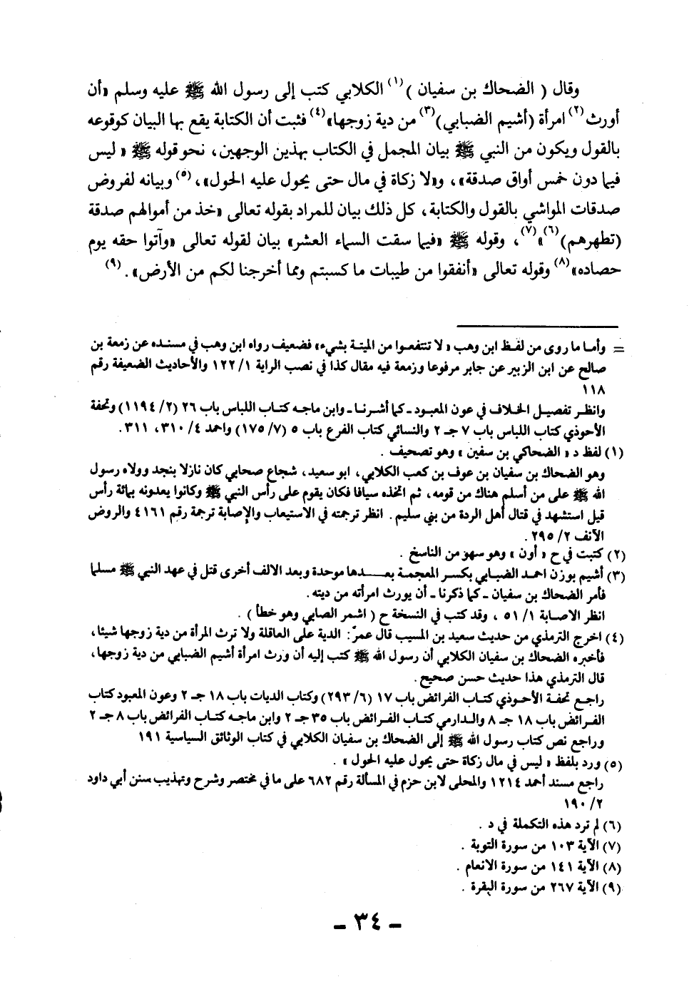 وَقَالَ (الضَّحَّاكُ بْنُ سُفْيَانَ) الْكِلَابِيُّ «كَتَبَ إلَيَّ رَسُولُ اللَّهِ - صَلَّى اللَّهُ عَلَيْهِ وَسَلَّمَ - أَنْ أُوَرِّثَ امْرَأَةَ أَشْيَمَ الضَّبَابِيِّ مِنْ دِيَةِ زَوْجِهَا» فَثَبَتَ أَنَّ الْكِتَابَةَ يَقَعُ بِهَا الْبَيَانُ كَوُقُوعِهِ بِالْقَوْلِ وَيَكُونُ مِنْ النَّبِيِّ - صَلَّى اللَّهُ عَلَيْهِ وَسَلَّمَ - بَيَانُ الْمُجْمَلِ فِي الْكِتَابِ بِهَذَيْنِ الْوَجْهَيْنِ، نَحْوُ قَوْلِهِ - صَلَّى اللَّهُ عَلَيْهِ وَسَلَّمَ - «لَيْسَ فِيمَا دُونَ خَمْسِ أَوَاقٍ صَدَقَةٌ» ، وَ «لَا زَكَاةَ فِي مَالٍ حَتَّى يَحُولَ عَلَيْهِ الْحَوْلُ» ، وَبَيَانُهُ لِفُرُوضِ صَدَقَاتِ الْمَوَاشِي بِالْقَوْلِ وَالْكِتَابَةِ، كُلّ ذَلِكَ بَيَانٌ لِلْمُرَادِ بِقَوْلِهِ تَعَالَى {خُذْ مِنْ أَمْوَالِهِمْ صَدَقَةً تُطَهِّرُهُمْ} [التوبة: 103] ، وَقَوْلُهُ - صَلَّى اللَّهُ عَلَيْهِ وَسَلَّمَ - «فِيمَا سَقَتْ السَّمَاءُ الْعُشْرُ» بَيَانٌ لِقَوْلِهِ تَعَالَى: {وَآتُوا حَقَّهُ يَوْمَ حَصَادِهِ} [الأنعام: 141] وقَوْله تَعَالَى {أَنْفِقُوا مِنْ طَيِّبَاتِ مَا كَسَبْتُمْ وَمِمَّا أَخْرَجْنَا لَكُمْ مِنْ الْأَرْضِ} [البقرة: 267] .