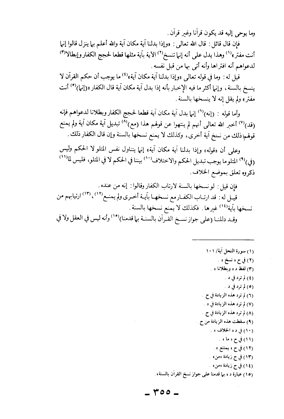 وَعَلَى أَنَّ " قَوْلَهُ {وَإِذَا بَدَّلْنَا آيَةً مَكَانَ آيَةٍ} [النحل: 101] إنَّمَا يَتَنَاوَلُ نَفْسَ الْمَتْلُوِّ لَا الْحُكْمَ وَلَيْسَ (فِي) الْمَتْلُوِّ مَا يُوجِبُ تَبْدِيلَ الْحُكْمِ وَالِاخْتِلَافُ بَيْنَنَا فِي الْحُكْمِ لَا فِي الْمَتْلُوِّ، فَلَيْسَ لِمَا ذَكَرُوهُ تَعَلُّقٌ بِمَوْضِعِ الْخِلَافِ.