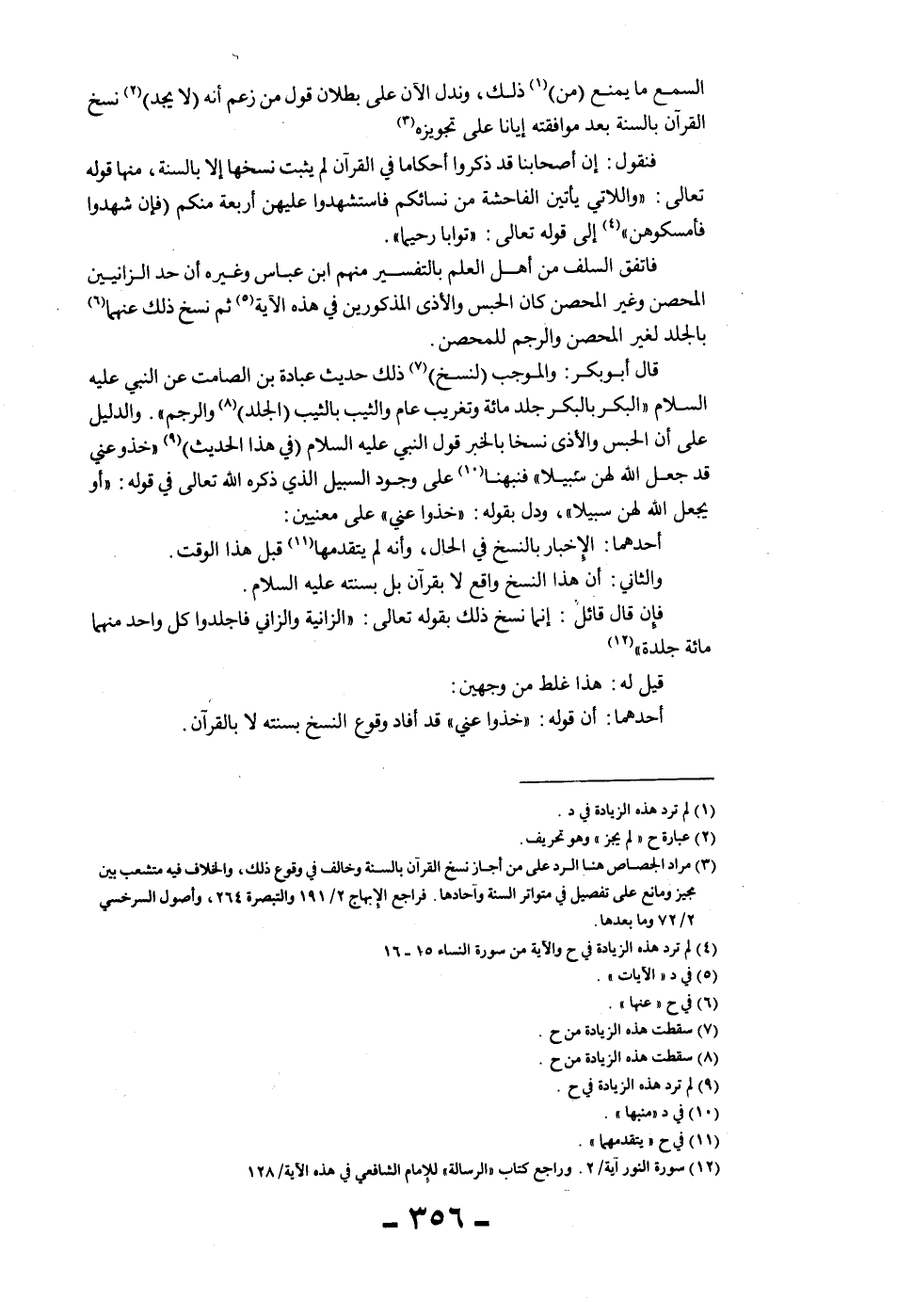 فَنَقُولُ: إنَّ أَصْحَابَنَا قَدْ ذَكَرُوا أَحْكَامًا فِي الْقُرْآنِ لَمْ يَثْبُتْ نَسْخُهَا إلَّا بِالسُّنَّةِ، مِنْهَا قَوْله تَعَالَى: {وَاَللَّاتِي يَأْتِينَ الْفَاحِشَةَ مِنْ نِسَائِكُمْ فَاسْتَشْهِدُوا عَلَيْهِنَّ أَرْبَعَةً مِنْكُمْ فَإِنْ شَهِدُوا فَأَمْسِكُوهُنَّ} [النساء: 15] إلَى قَوْله تَعَالَى: {تَوَّابًا رَحِيمًا} [النساء: 16] . فَاتَّفَقَ السَّلَفُ مِنْ أَهْلِ الْعِلْمِ بِالتَّفْسِيرِ مِنْهُمْ ابْنُ عَبَّاسٍ وَغَيْرُهُ أَنَّ حَدَّ الزَّانِيَيْنِ الْمُحْصَنِ وَغَيْرِ الْمُحْصَنِ كَانَ الْحَبْسَ وَالْأَذَى الْمَذْكُورَيْنِ فِي هَذِهِ الْآيَةِ ثُمَّ نُسِخَ ذَلِكَ عَنْهُمَا بِالْجَلْدِ لِغَيْرِ الْمُحْصَنِ وَالرَّجْمِ لِلْمُحْصَنِ.