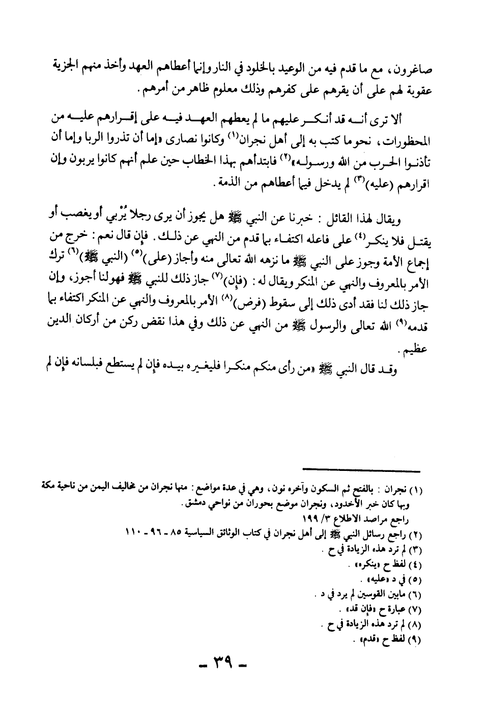 صَاغِرُونَ، مَعَ مَا قَدَّمَ فِيهِ مِنْ الْوَعِيدِ بِالْخُلُودِ فِي النَّارِ وَإِنَّمَا أَعْطَاهُمْ الْعَهْدَ وَأَخَذَ مِنْهُمْ الْجِزْيَةَ عُقُوبَةً لَهُمْ عَلَى أَنْ يُقِرَّهُمْ عَلَى كُفْرِهِمْ وَذَلِكَ مَعْلُومٌ ظَاهِرٌ مِنْ أَمْرِهِمْ. أَلَا تَرَى أَنَّهُ قَدْ أَنْكَرَ عَلَيْهِمْ مَا لَمْ يُعْطِهِمْ الْعَهْدَ فِيهِ عَلَى إقْرَارِهِمْ عَلَيْهِ مِنْ الْمَحْظُورَاتِ، نَحْوُ مَا كَتَبَ بِهِ إلَى أَهْلِ نَجْرَانَ وَكَانُوا نَصَارَى «إمَّا أَنْ تَذَرُوا الرِّبَا وَإِمَّا أَنْ تَأْذَنُوا بِحَرْبٍ مِنْ اللَّهِ وَرَسُولِهِ» فَابْتَدَأَهُمْ بِهَذَا الْخِطَابِ حِينَ عَلِمَ أَنَّهُمْ كَانُوا يُرْبُونَ وَأَنَّ إقْرَارَهُمْ (عَلَيْهِ) لَمْ يَدْخُلْ فِيمَا أَعْطَاهُمْ مِنْ الذِّمَّةِ.