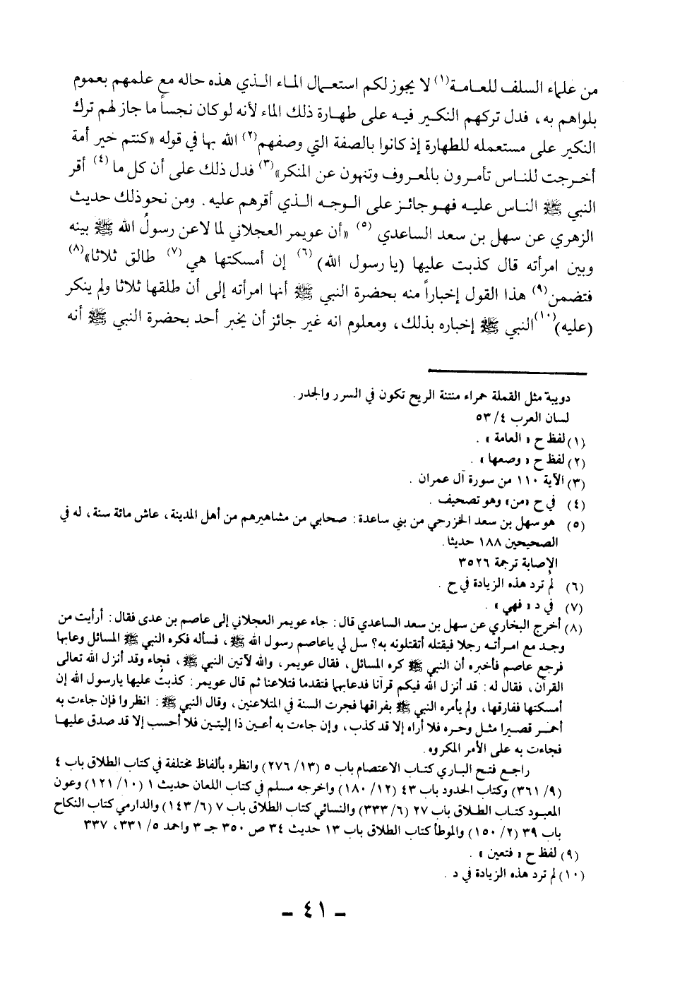 وَمِنْ نَحْوِ ذَلِكَ حَدِيثُ الزُّهْرِيِّ عَنْ سَهْلِ بْنِ سَعْدٍ السَّاعِدِيِّ «أَنَّ عُوَيْمِرًا الْعَجْلَانِيَّ لَمَّا لَاعَنَ رَسُولُ اللَّهِ - صَلَّى اللَّهُ عَلَيْهِ وَسَلَّمَ - بَيْنَهُ وَبَيْنَ امْرَأَتِهِ قَالَ كَذَبْت عَلَيْهَا يَا رَسُولَ اللَّهِ إنْ أَمْسَكْتهَا هِيَ طَالِقٌ ثَلَاثًا» فَتَضَمَّنَ هَذَا الْقَوْلُ إخْبَارًا مِنْهُ بِحَضْرَةِ النَّبِيِّ - صَلَّى اللَّهُ عَلَيْهِ وَسَلَّمَ - أَنَّهَا امْرَأَتُهُ إلَى أَنْ طَلَّقَهَا ثَلَاثًا وَلَمْ يُنْكِرْ (عَلَيْهِ) النَّبِيُّ - صَلَّى اللَّهُ عَلَيْهِ وَسَلَّمَ - إخْبَارَهُ بِذَلِكَ، وَمَعْلُومٌ أَنَّهُ غَيْرُ جَائِزٍ أَنْ يُخْبِرُ أَحَدٌ بِحَضْرَةِ النَّبِيِّ - صَلَّى اللَّهُ عَلَيْهِ وَسَلَّمَ - أَنَّهُ