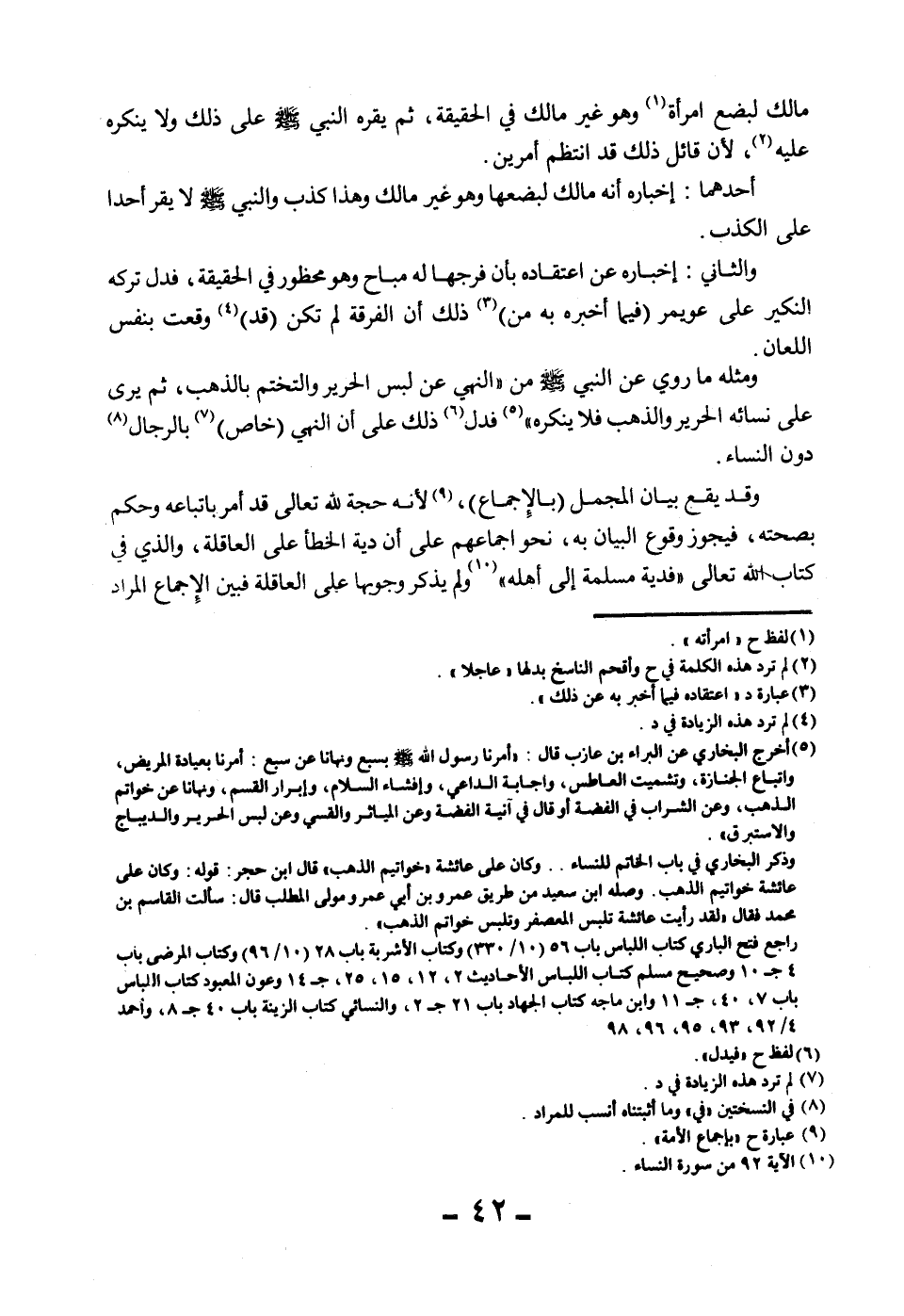 وَالثَّانِي: إخْبَارُهُ عَنْ اعْتِقَادِهِ بِأَنَّ فَرْجَهَا لَهُ مُبَاحٌ وَهُوَ مَحْظُورٌ فِي الْحَقِيقَةِ، فَدَلَّ تَرْكُهُ النَّكِيرَ عَلَى عُوَيْمِرٍ (فِيمَا أَخْبَرَهُ بِهِ مِنْ) ذَلِكَ أَنَّ الْفُرْقَةَ لَمْ تَكُنْ (قَدْ) وَقَعَتْ بِنَفْسِ اللِّعَانِ. وَمِثْلُهُ مَا رُوِيَ عَنْ النَّبِيِّ - صَلَّى اللَّهُ عَلَيْهِ وَسَلَّمَ - مِنْ «النَّهْيِ عَنْ لُبْسِ الْحَرِيرِ وَالتَّخَتُّمِ بِالذَّهَبِ، ثُمَّ يَرَى عَلَى نِسَائِهِ الْحَرِيرَ وَالذَّهَبَ فَلَا يُنْكِرُهُ» فَدَلَّ ذَلِكَ عَلَى أَنَّ النَّهْيَ (خَاصٌّ) بِالرِّجَالِ دُونَ النِّسَاءِ.