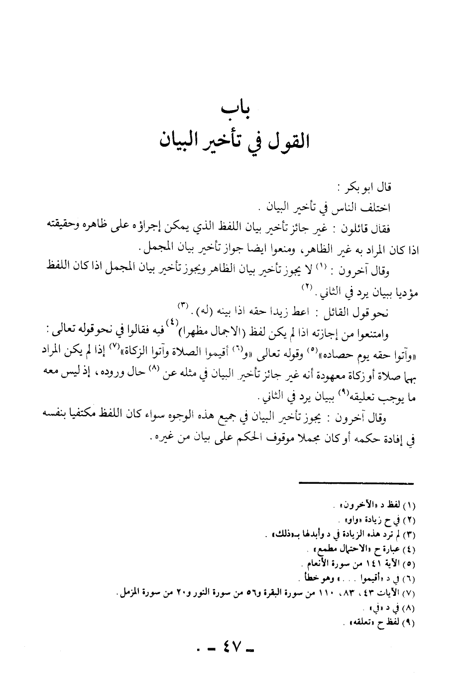 [بَابُ الْقَوْلِ فِي تَأْخِيرِ الْبَيَانِ]