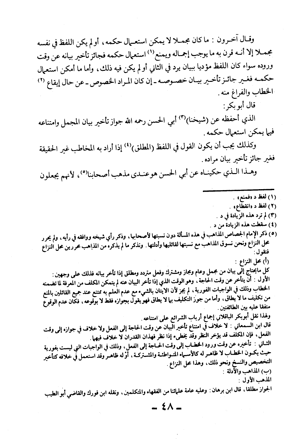 قَالَ أَبُو بَكْرٍ: الَّذِي أَحْفَظُهُ عَنْ (شَيْخِنَا) أَبِي الْحَسَنِ - رَحِمَهُ اللَّهُ - جَوَازَ تَأْخِيرِ بَيَانِ الْمُجْمَلِ وَامْتِنَاعَهُ فِيمَا يُمْكِنُ اسْتِعْمَالُ حُكْمِهِ. وَكَذَلِكَ يَجِبُ أَنْ يَكُونَ الْقَوْلُ فِي اللَّفْظِ (الْمُطْلَقِ) إذَا أَرَادَ بِهِ الْمُخَاطَبُ غَيْرَ الْحَقِيقَةِ فَغَيْرُ جَائِزٍ تَأْخِيرُ بَيَانِ مُرَادِهِ.