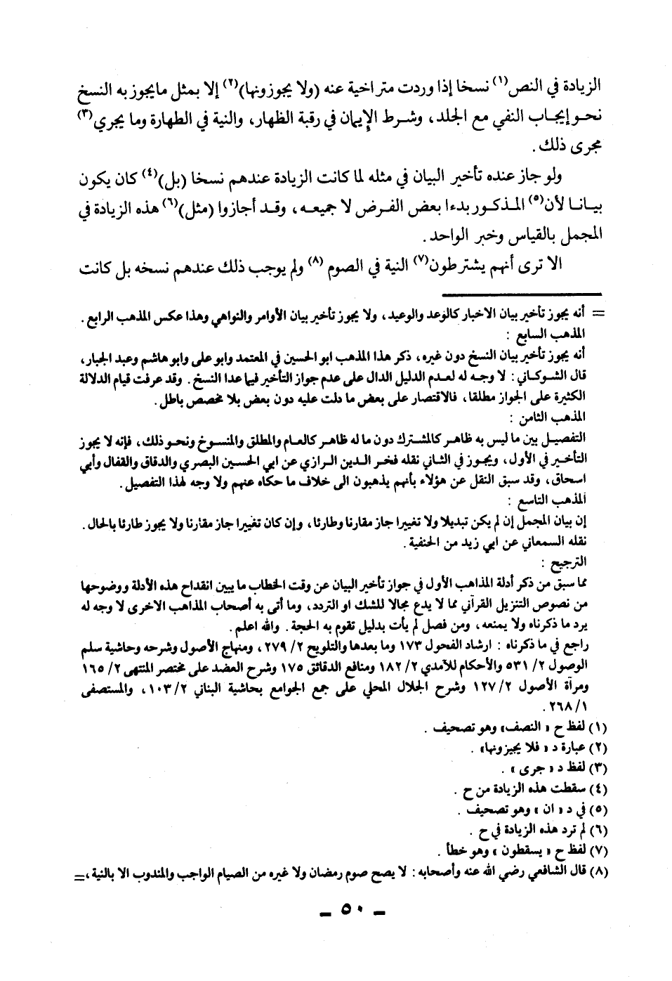 الزِّيَادَةَ فِي النَّصِّ نَسْخًا إذَا وَرَدَتْ مُتَرَاخِيَةً عَنْهُ (وَلَا يُجَوِّزُونَهَا) إلَّا بِمِثْلِ مَا يَجُوزُ بِهِ النَّسْخُ نَحْوُ إيجَابِ النَّفْيِ مَعَ الْجَلْدِ، وَشَرْطِ الْإِيمَانِ فِي رَقَبَةِ الظِّهَارِ، وَالنِّيَّةِ فِي الطَّهَارَةِ وَمَا يَجْرِي مَجْرَى ذَلِكَ. وَلَوْ جَازَ عِنْدَهُ تَأْخِيرُ الْبَيَانِ فِي مِثْلِهِ لَمَا كَانَتْ الزِّيَادَةُ عِنْدَهُمْ نَسْخًا (بَلْ) كَانَ يَكُونُ بَيَانًا لِأَنَّ الْمَذْكُورَ بَدْءًا بَعْضُ الْفَرْضِ لَا جَمِيعُهُ، وَقَدْ أَجَازُوا (مِثْلَ) هَذِهِ الزِّيَادَةِ فِي الْمُجْمَلِ بِالْقِيَاسِ وَخَبَرِ الْوَاحِدِ.